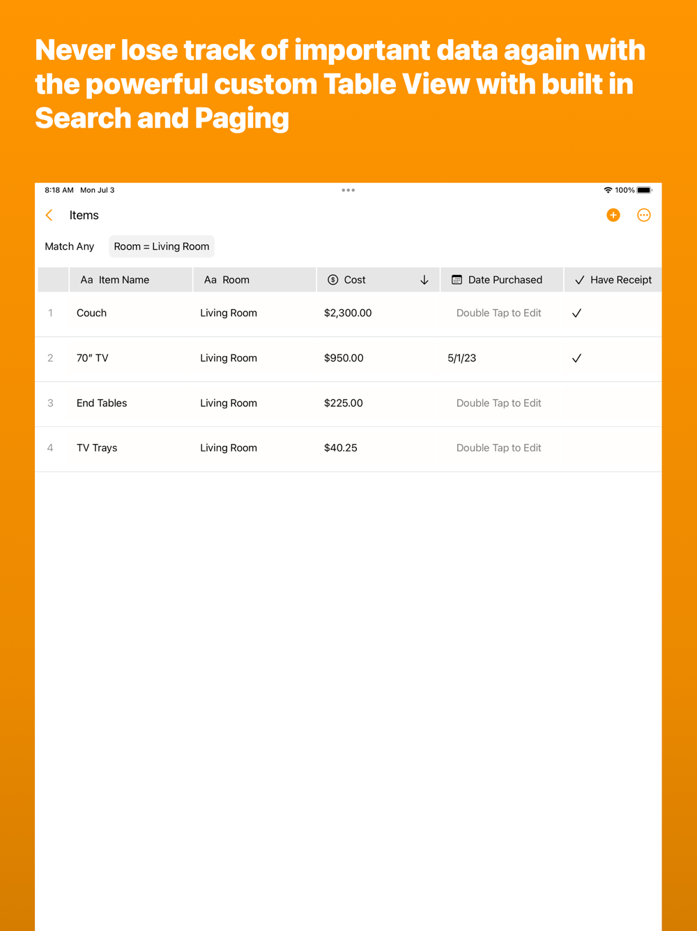 New Data Types Support:- Color Column- Image ColumnNew Data View:- In additional to the 2 dimensional table view you can now also view your data as a list with 3 different row configurationsDefault Values:- You can now specify default values for your columns when creating a new row. The values are data type specific so that you can create constant values, such as "Hello" for a text column, $12.99 for a currency column, True for a boolean column, etc... for date and time columns it's even better you can specify an offset instead of a fixed value, such as 1 Day from now