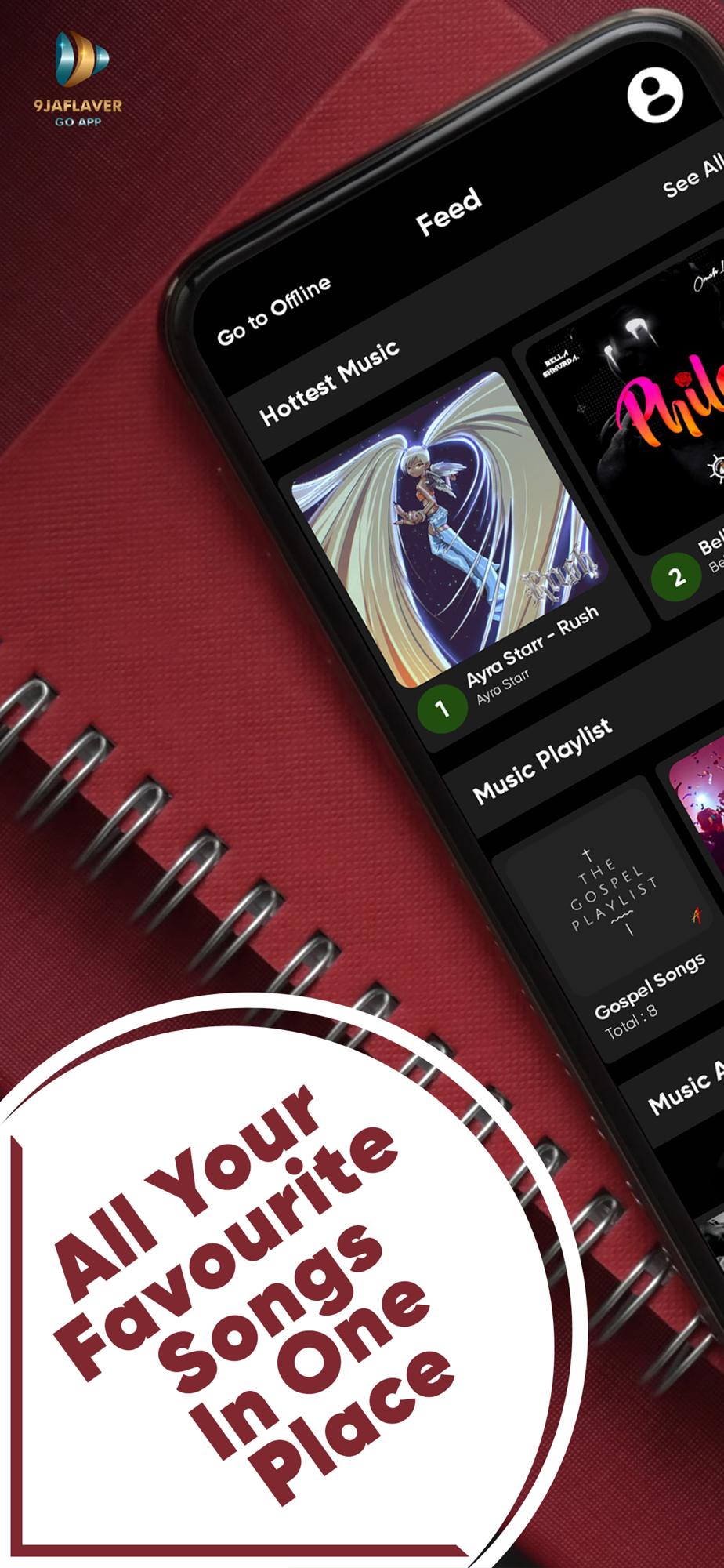 - You can make "9jaflaver go app" your native player as the offline section of this app gives you the best offline music playing experience, as you can customize your own personal playlists