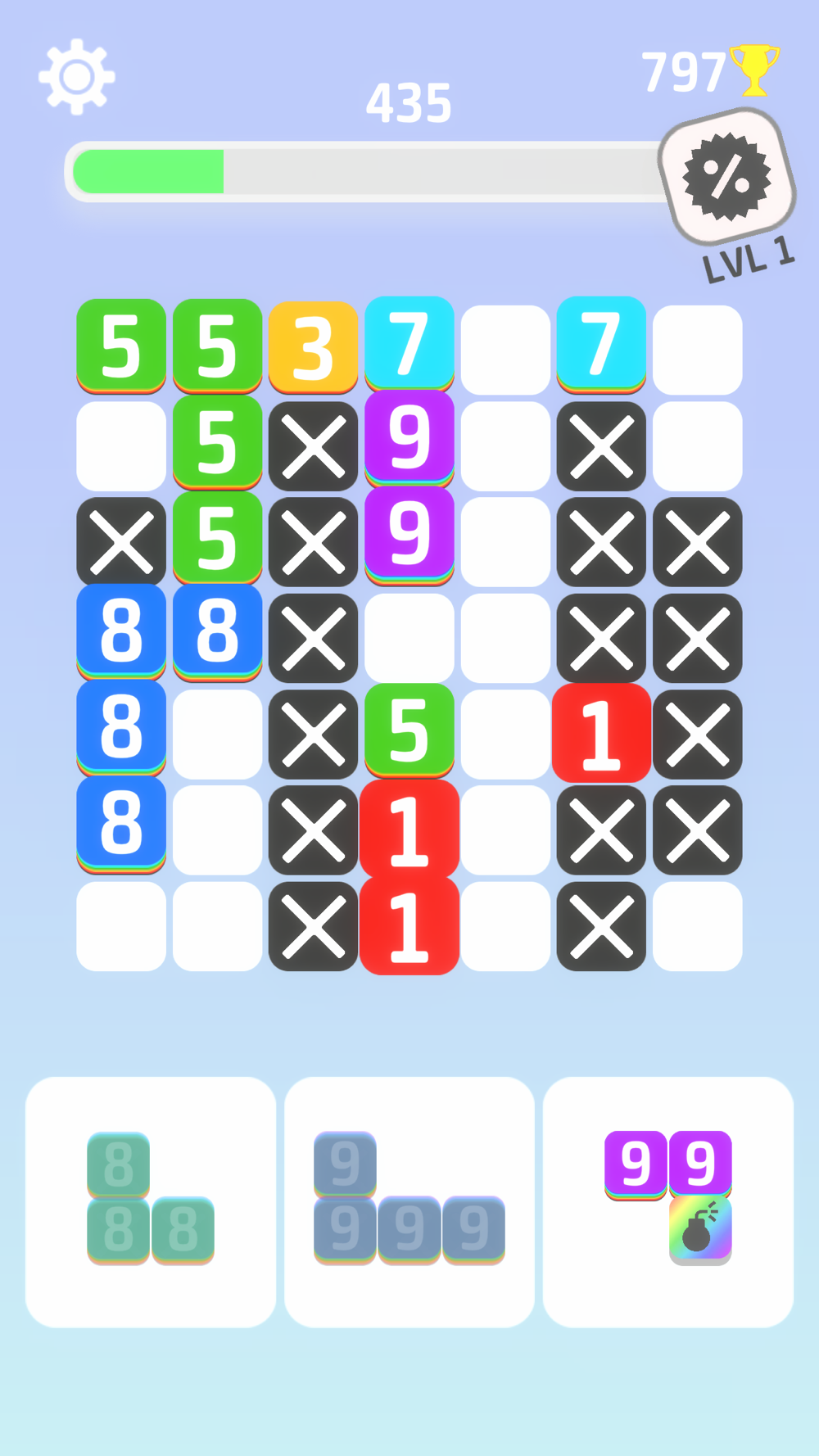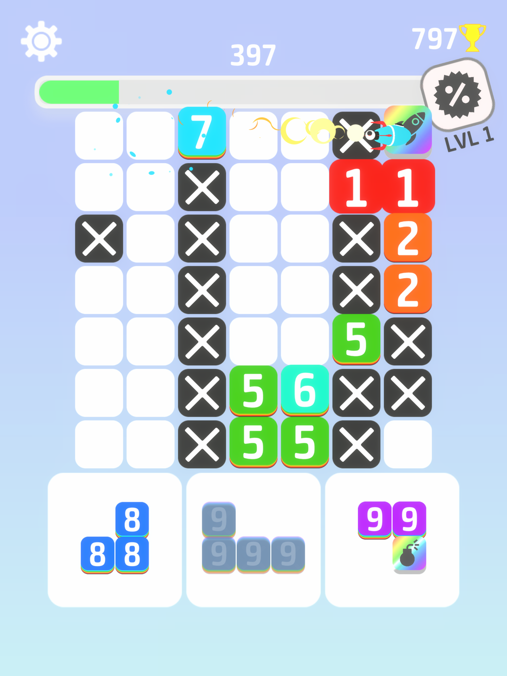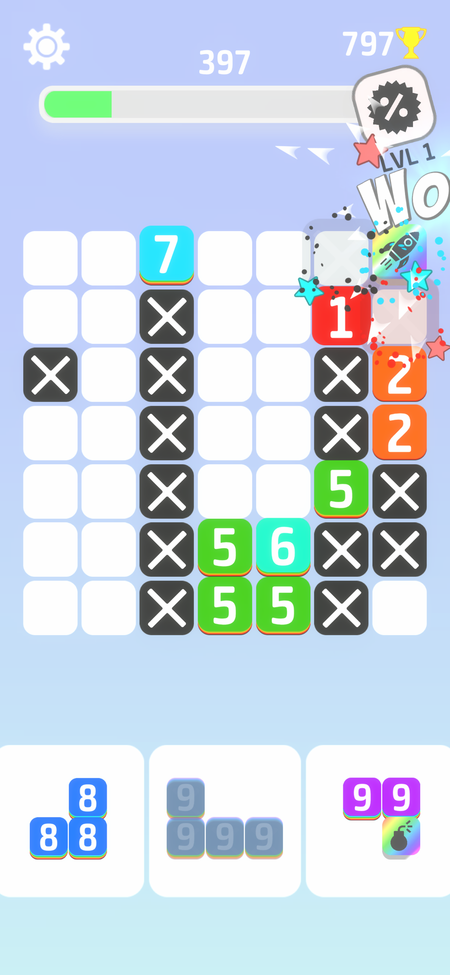 After each move, all numbers reduces by 1. Make sure to remove the line before any number on it reaches 0. Remove two lines in a row and block values will increase.