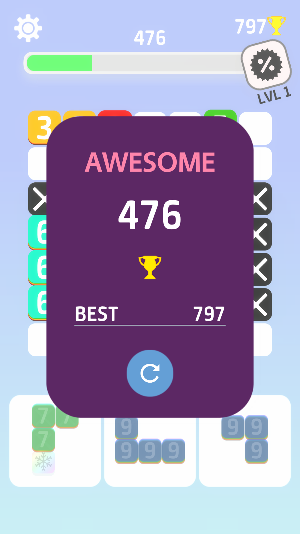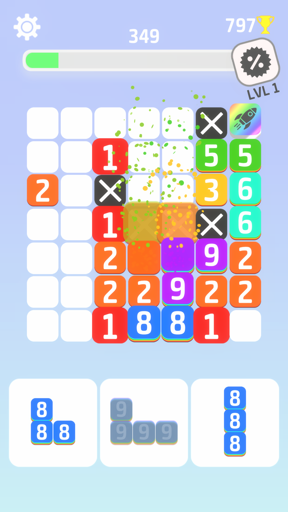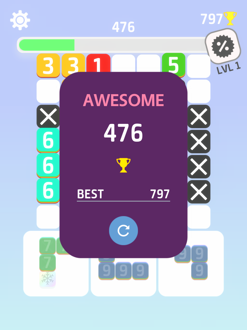 After each move, all numbers reduces by 1. Make sure to remove the line before any number on it reaches 0. Remove two lines in a row and block values will increase.