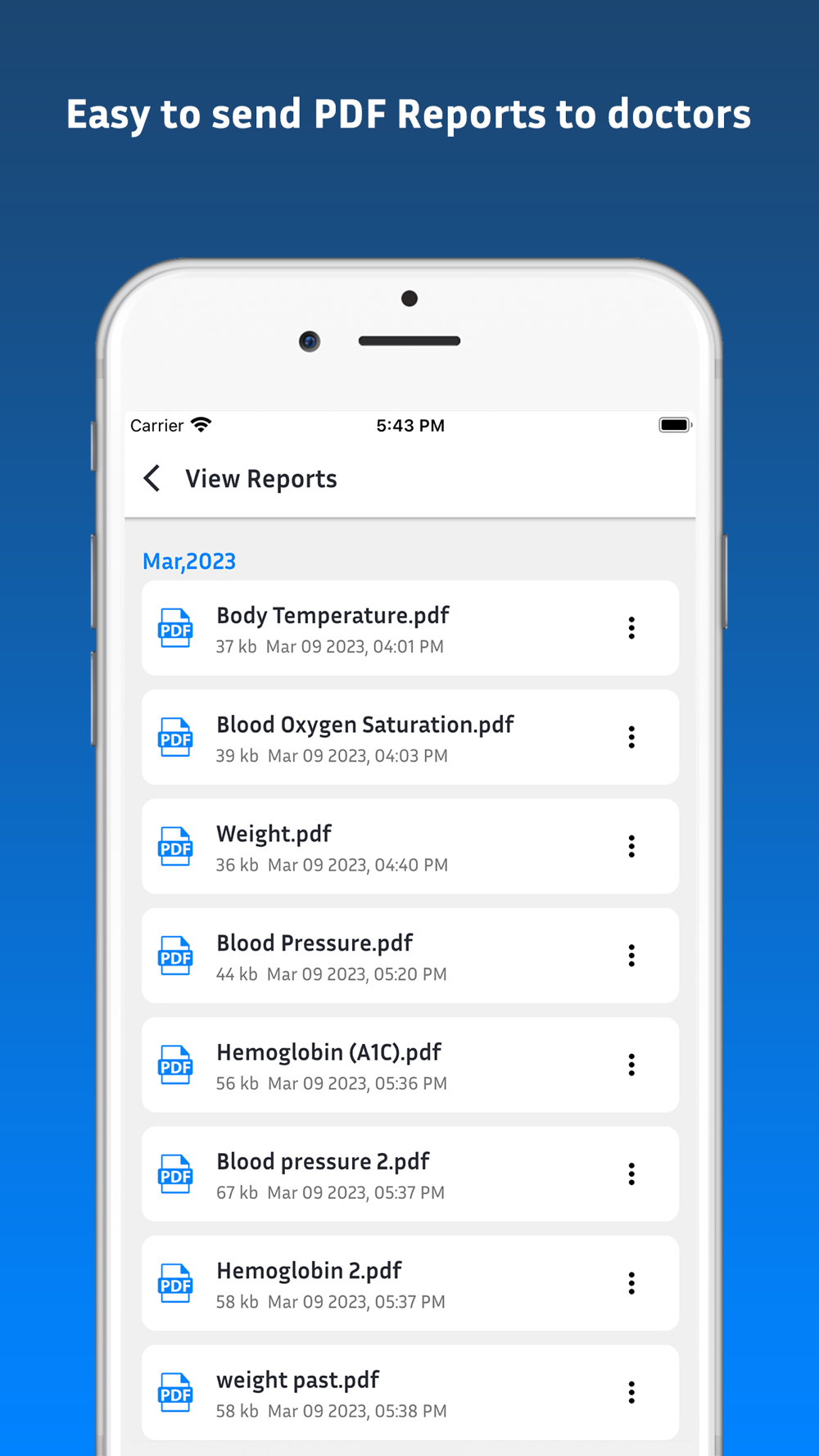 Graphical States: Easily compare and analyze your blood glucose, blood pressure (BP), body temperature, Blood Oxygen, Hemoglobin (A1C), and body weight by looking at all the statistics.