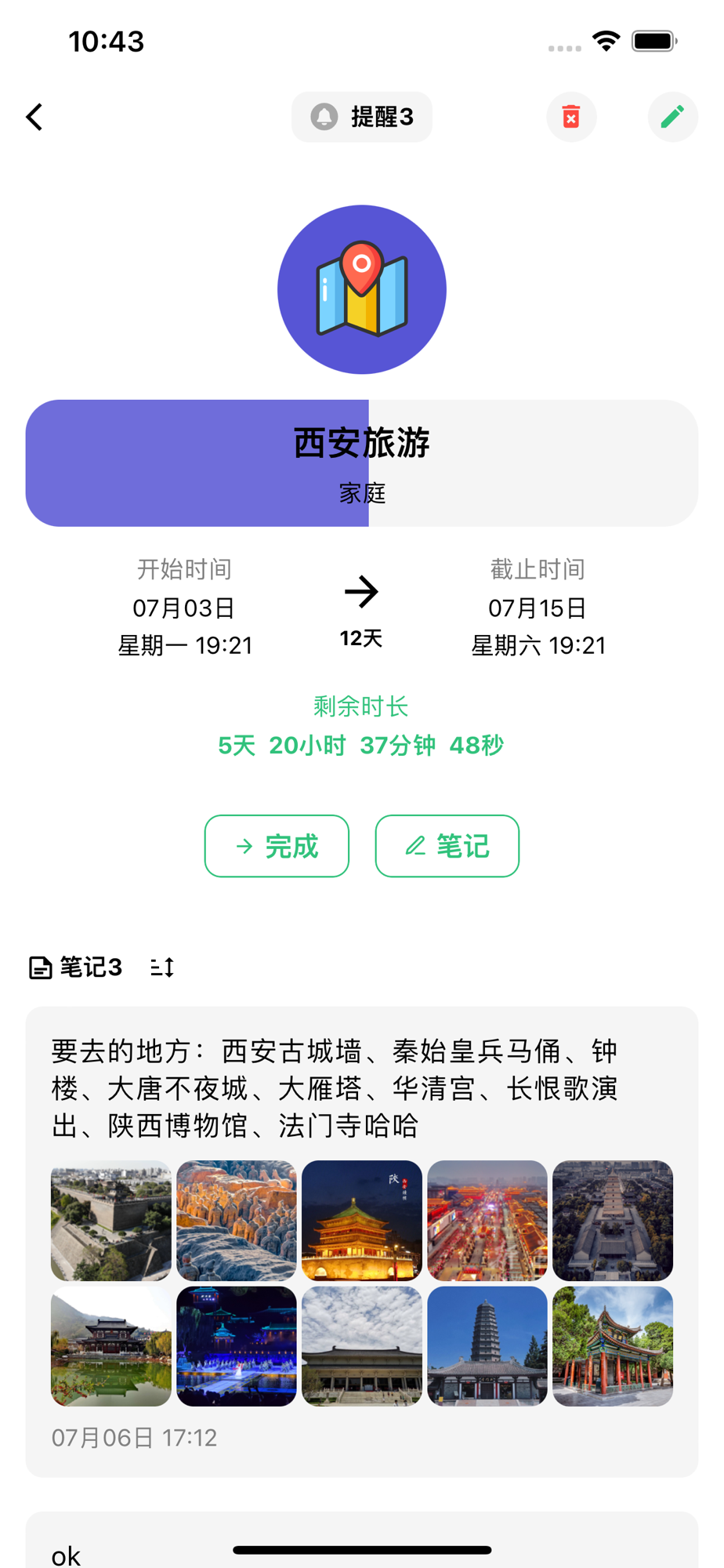 「时间待办」提供了笔记功能,您可以在每个任务下面记录多个笔记,每个笔记支持文字和图片。您通过笔记收集有关这个任务的各种资料,或者每天记录任务的具体进展情况。所有的笔记会一直在任务中展示,当您完成了一个任务后,您可以通过浏览相应的笔记,进行任务复盘,或者体会当时的点点滴滴。
