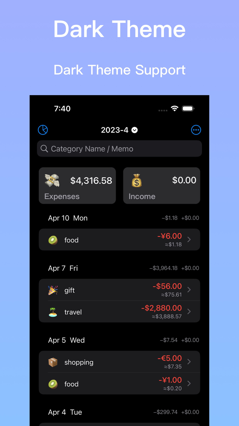 Unlike company bookkeeping and family bookkeeping, personal bookkeeping should be more private and simple. Your own data should be completely managed by yourself: you can save it locally and in the cloud if you like, and decide when to back up and restore it at any time, without worrying about data loss anxiety caused by problems with the server. Moneys stores all data locally on the mobile phone, Your data is only yours.