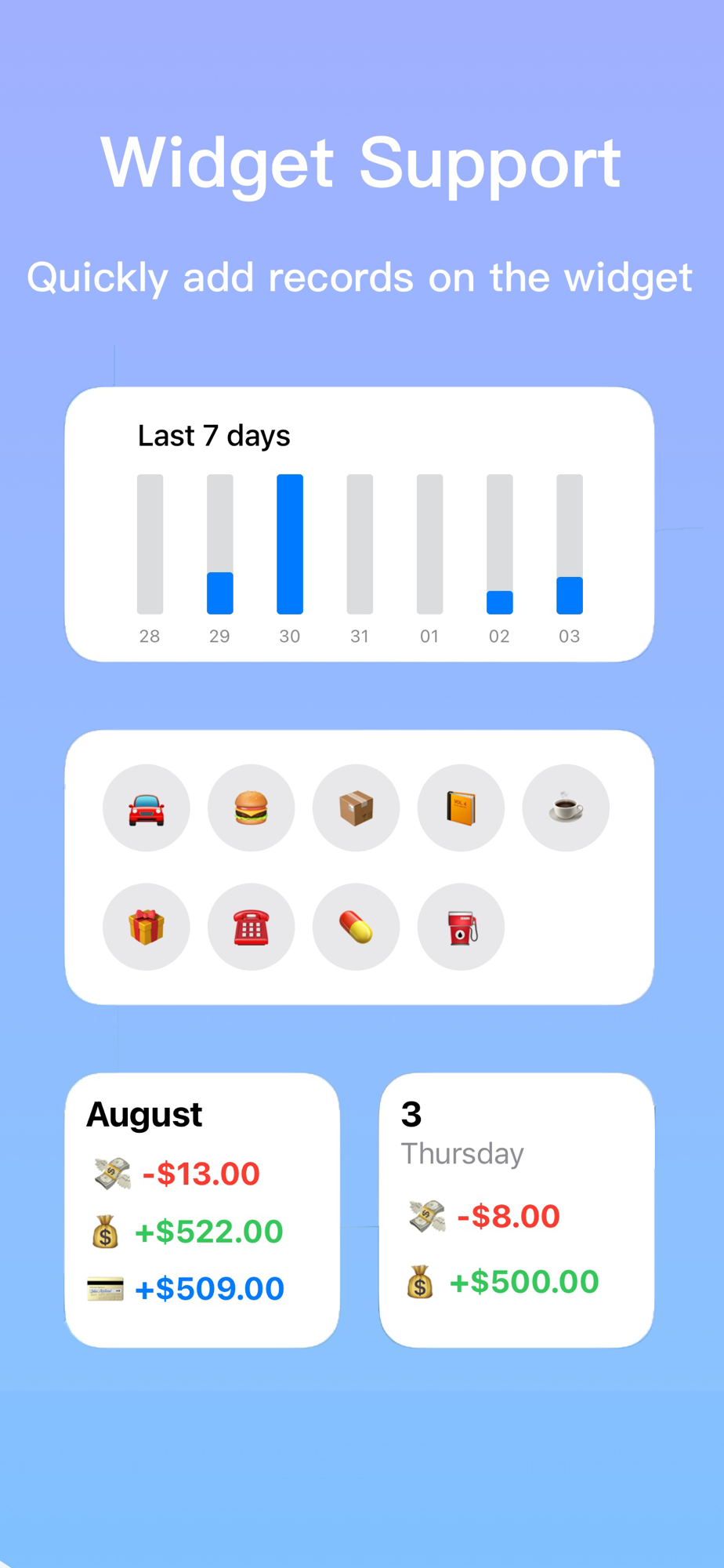 · 2 Widgets Added + Expenses & income & balance this month + Quickly add expenses by clicking an emoji