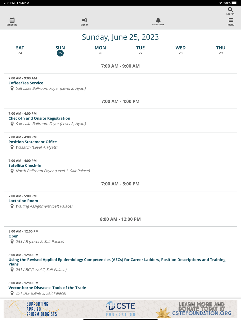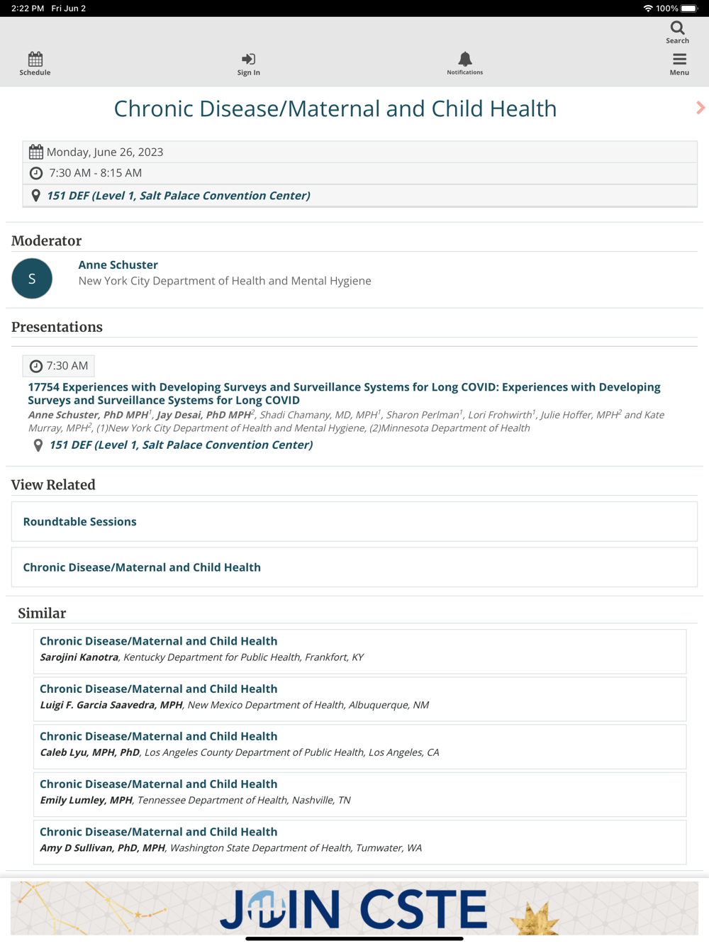 The 2023 CSTE Annual Conference will be held on June 25th-29th, 2023 in Salt Lake City, UT. Login to view Sessions and Papers saved as favorites. View schedules, locations, floor plans, and people. Attendees will now be able to facilitate their experience at the meeting using the mobile app.