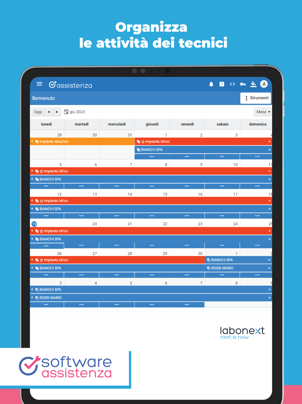 Un pratico planning ti consente di gestire gli appuntamenti di assistenza per i tuoi clienti e assegnare i tecnici che si occuperanno dell'intervento.