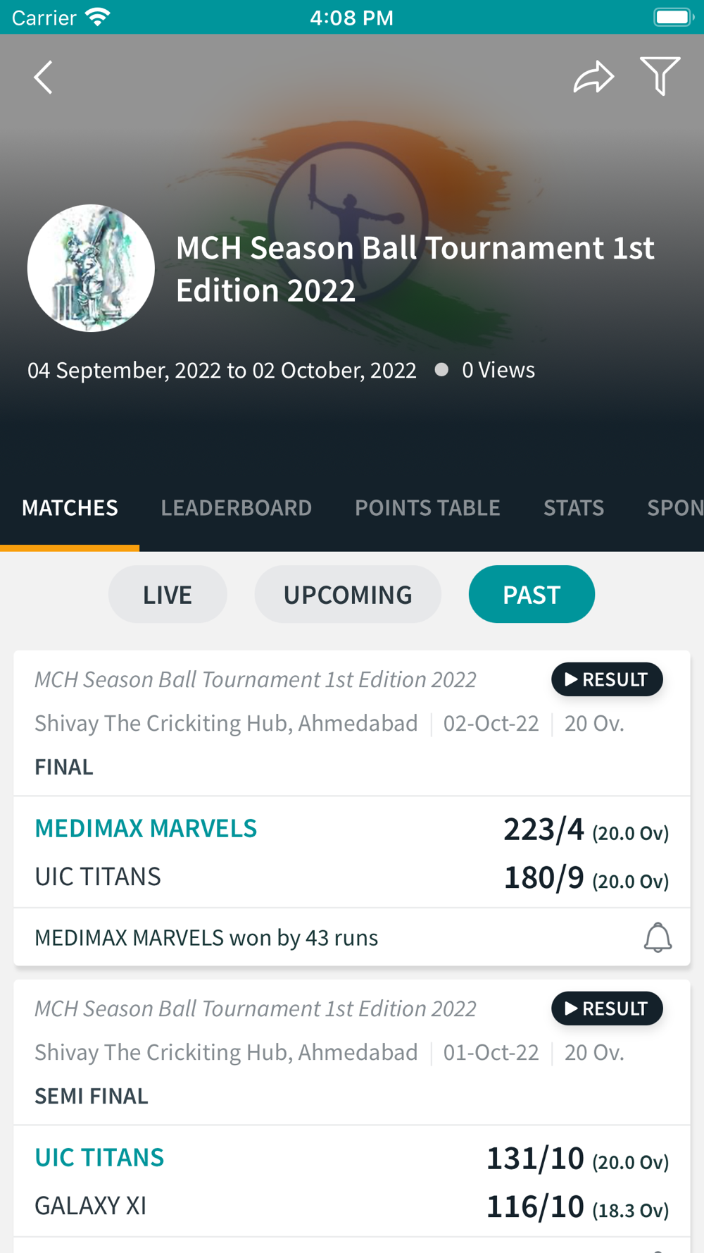 Players, organizers, and followers of this Cricket tournament can follow the LIVE scores, Leaderboard, Boundary Tracker, Points Table, and much more using this app. Scores are published LIVE ball to ball to this app and on the CricHeroes app. Enjoy!