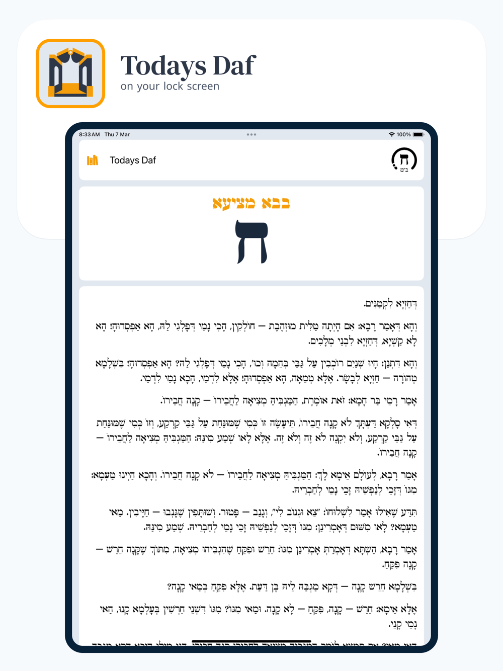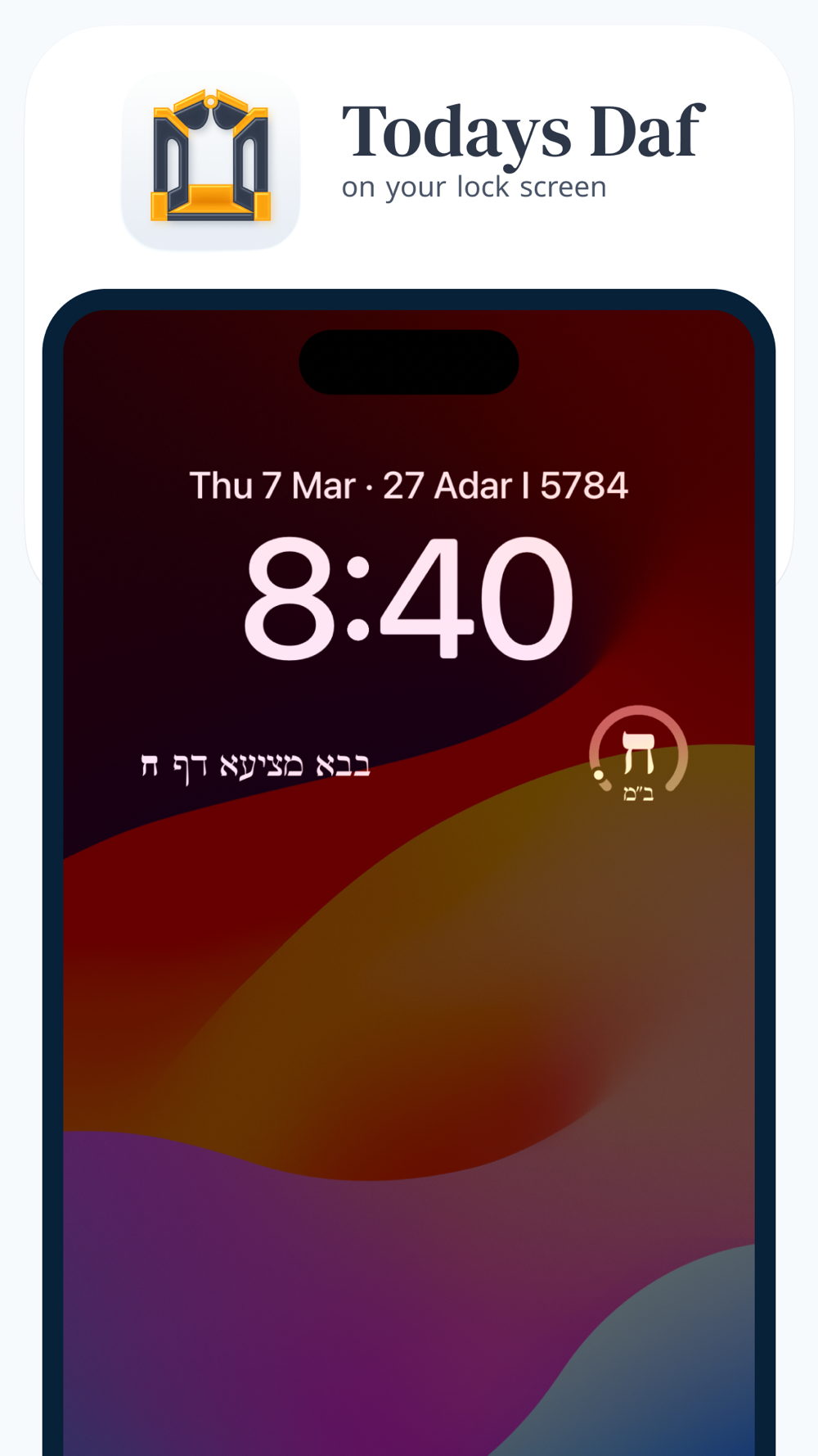 Never ask this question again, with this lock screen widget you'll always have the current Daf at a glance. Also see the completion progress of the current Tractate.