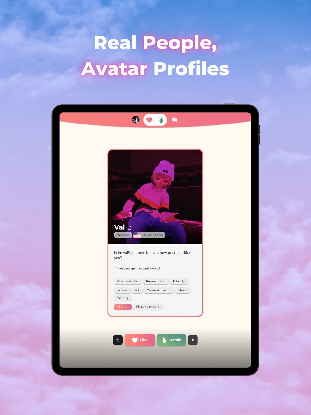 VR lets you express yourself fully. Meeting other people through avatars is fun, safe, and low-stress.
