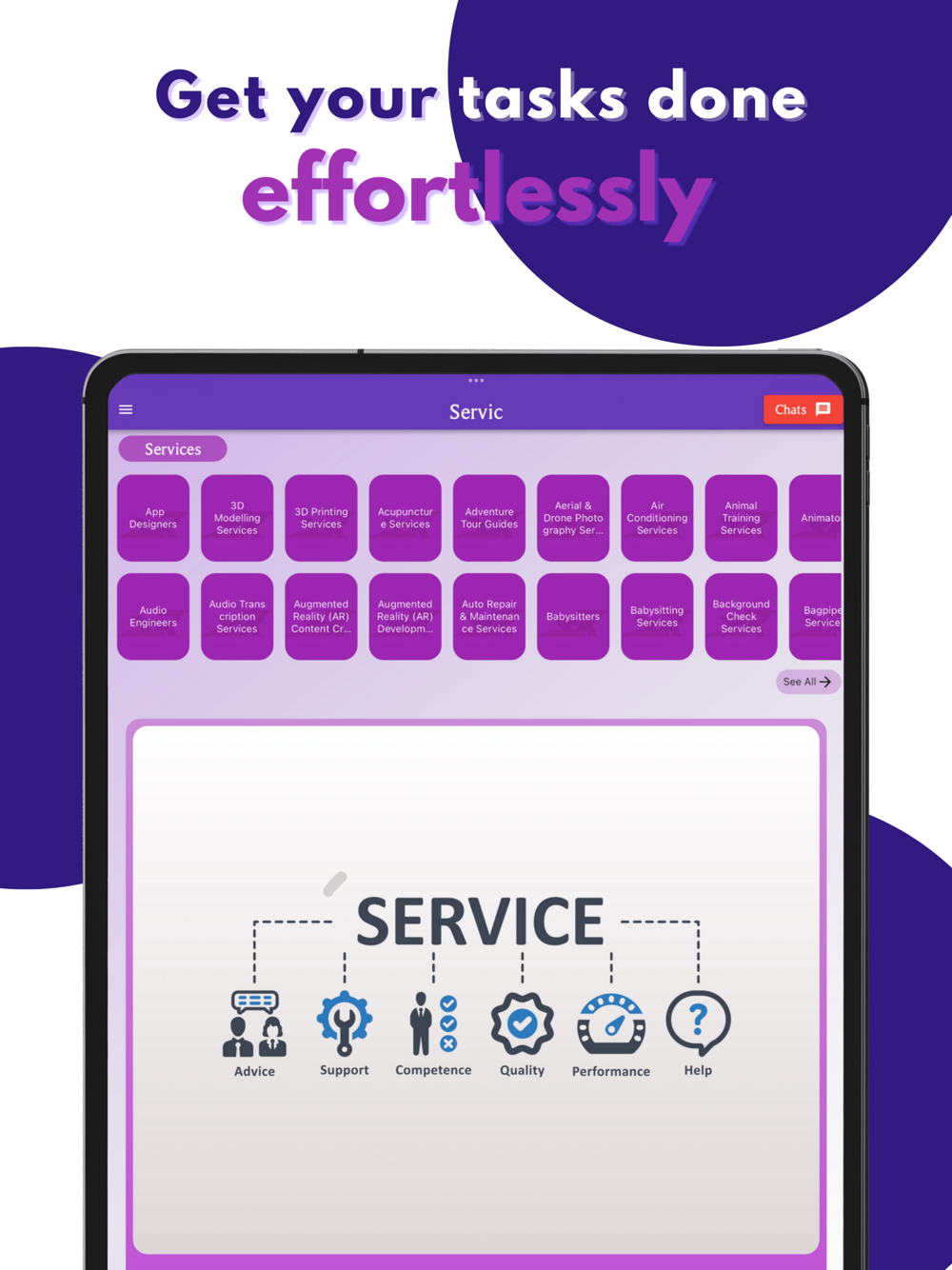 Servic is a user-friendly application that facilitates seamless connections between service providers and seekers within their local and national communities enabling job opportunities. Tailored for skillful individuals, the app serves as a convenient platform for reaching out to people in their area as well as their country.