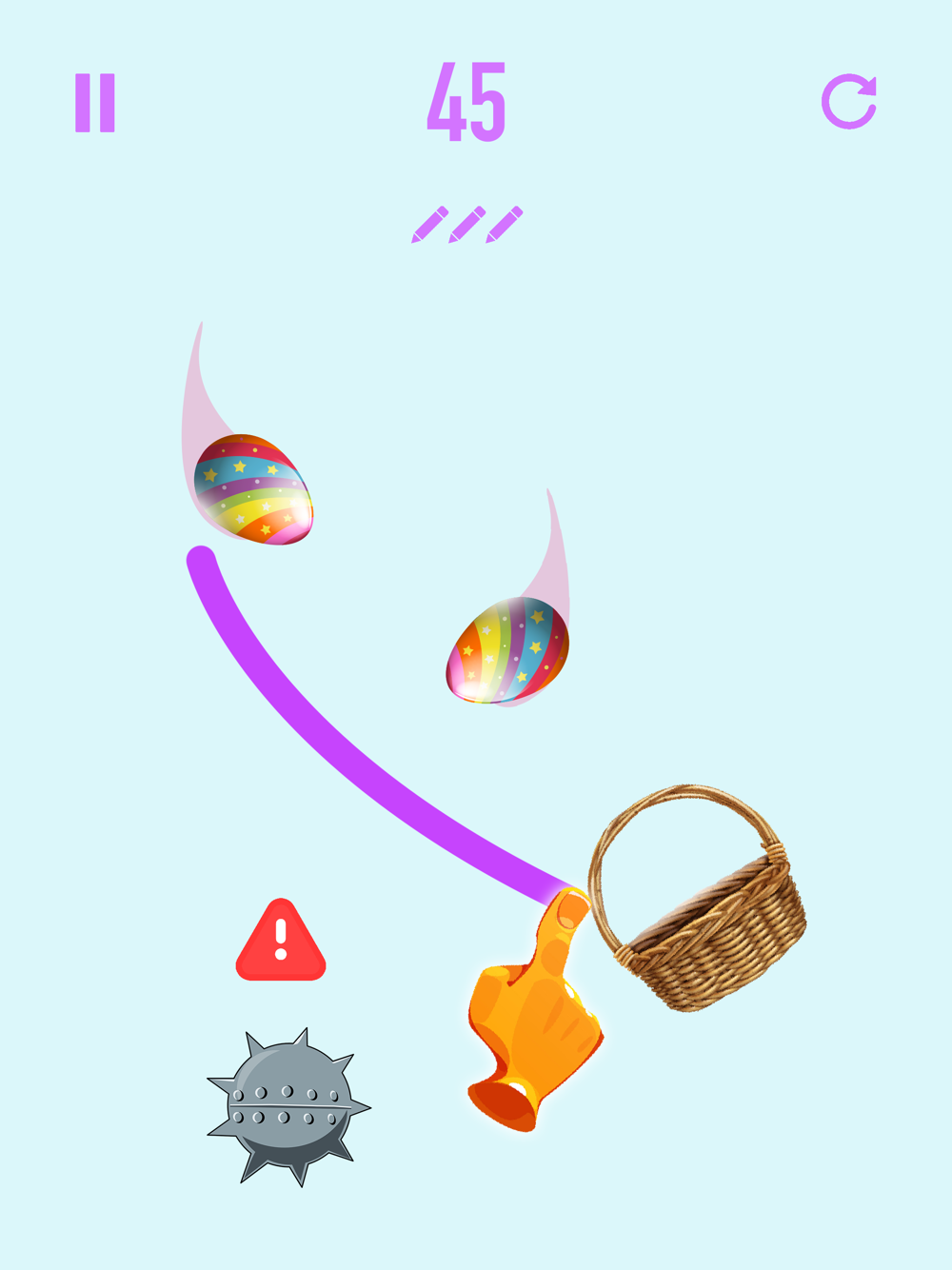 Draw lines with curves and angles to get the eggs into the basket easily. Sometimes you will have more than one egg at the same time, so be smart and get them both in!