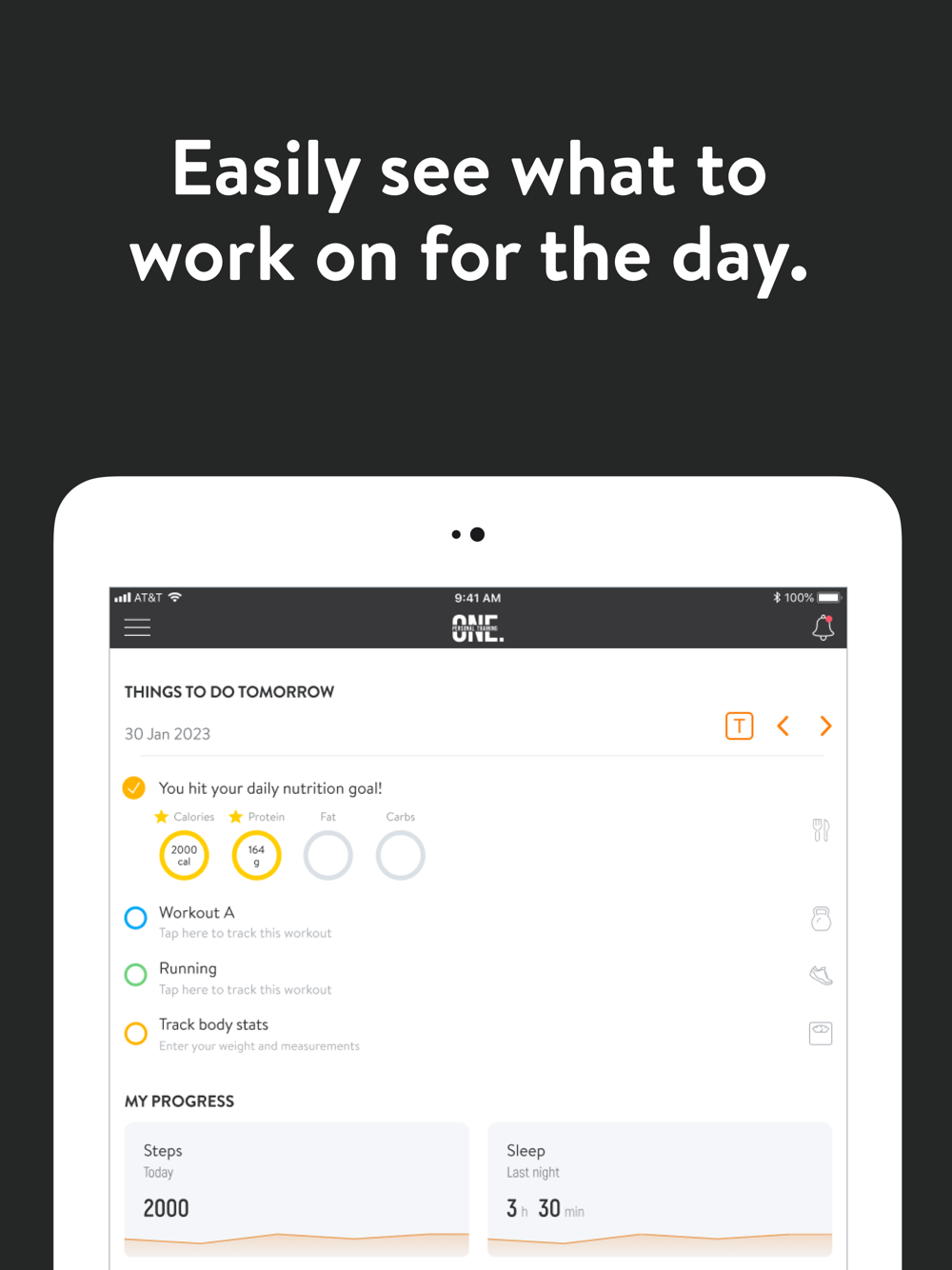 Welcome to ONE Personal Training! By joining our elite community, you gain exclusive access to the incredible ONE App. Prepare to embark on a fitness journey like no other, with workout programs meticulously crafted to propel you towards your unique health and fitness goals. Immerse yourself in a world where you can effortlessly track and monitor your workouts, nutrition, lifestyle habits, measurements, and results—all while enjoying personalized guidance from your dedicated coach. Elevate your training experience to new heights and unlock the pinnacle of personalized support and success. Embrace the power of ONE Personal Training and redefine what's possible for your fitness journey!