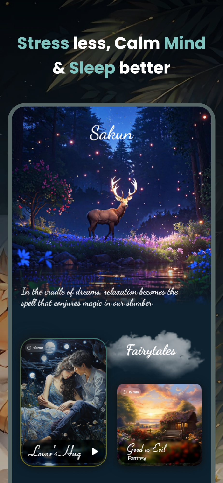 Tired of sleep apps that just don't work? Sakun is your solution. This innovative sleep and relaxation app uses enchanting fantasy and immersive experiences to help you and your kids improve sleep quality, reduce anxiety, and overcome nightmares. What does Sakun have?