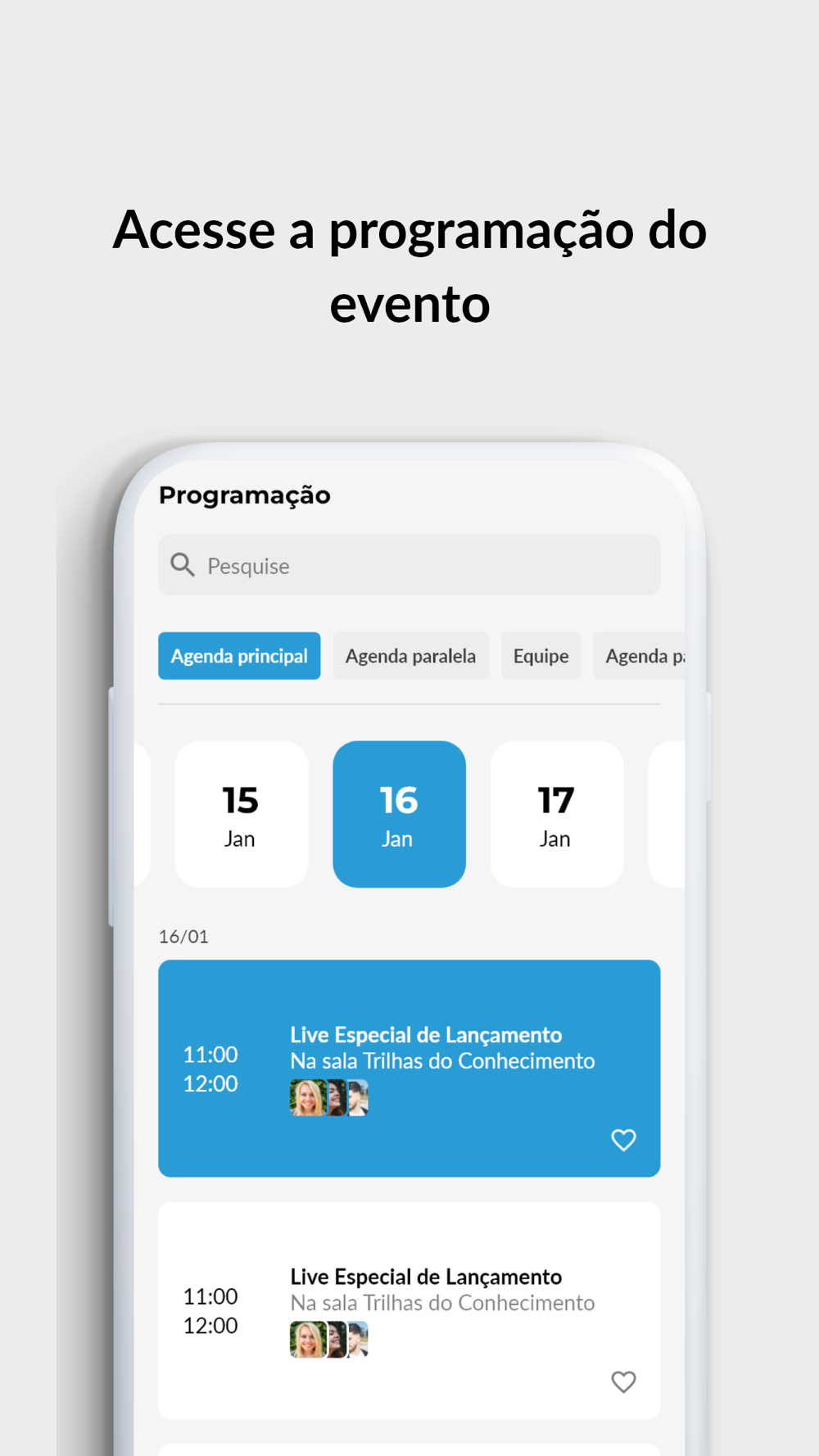 Com o aplicativo “Legado de Gigantes”, você tem acesso a uma rede social exclusiva, pode fazer novos contatos, enviar perguntas aos palestrantes, trocar mensagens com outros participantes, enfim, interagir com a comunidade. Além disso, você pode consultar a programação, avaliar conteúdos, dar feedback e responder quizzes. Utilize o APP e aproveite ao máximo os recursos.