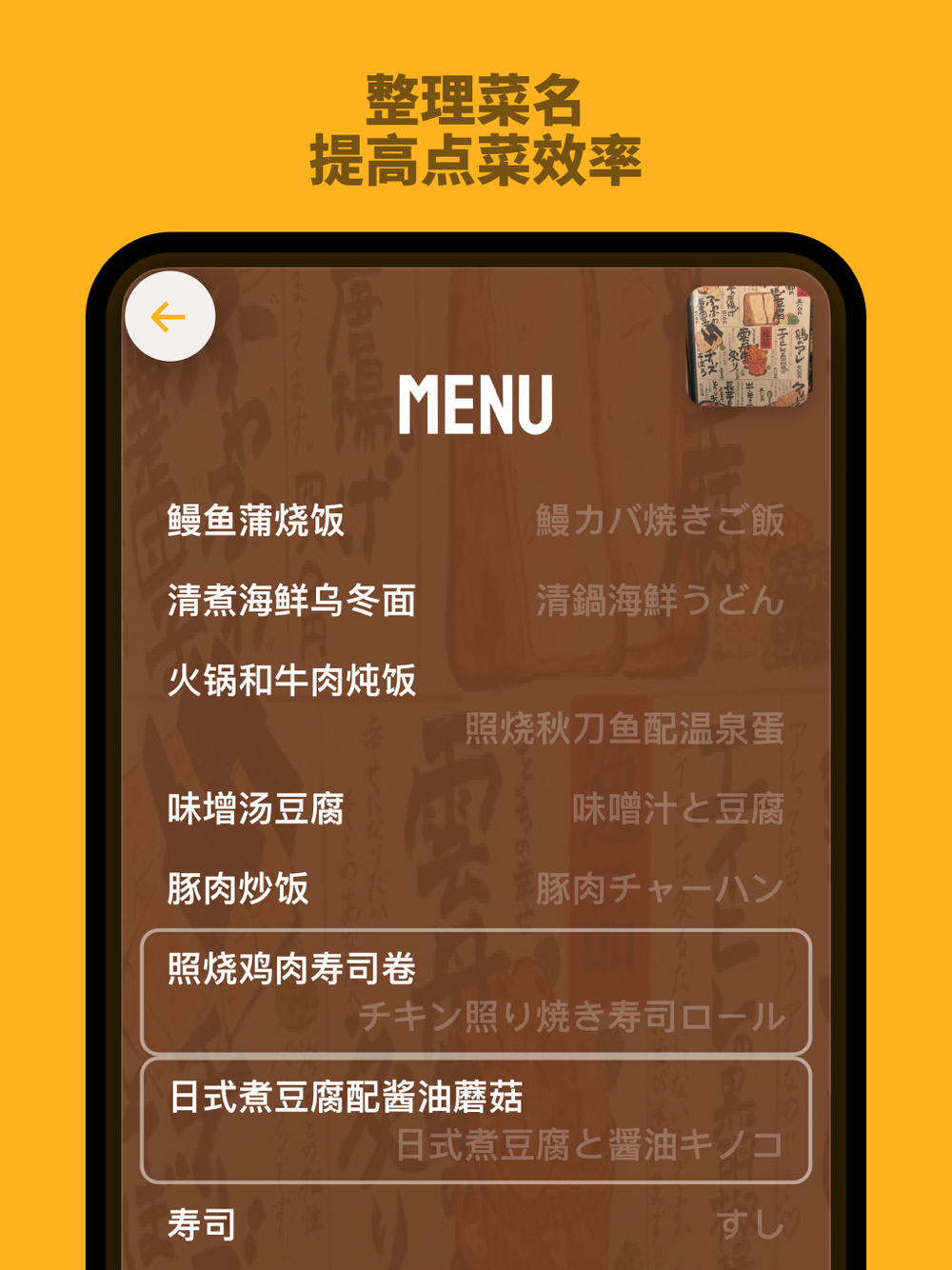 打开后拍照或选择图片即可进行翻译,支持多种语言,翻译页面左下角四个图标分别为双语对比模式、翻译模式、原图模式和文字菜单模式,点击任一框框即可使用「介绍」功能获得详细解析,加入「想点」后即可在右下角「想点」中完成点餐。欢迎反馈问题。