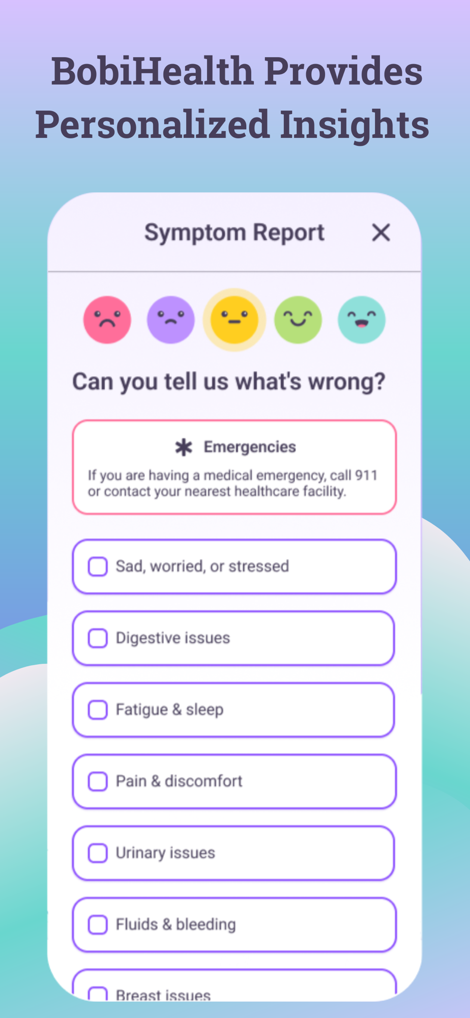 Not for Emergencies: The Bobi app is not intended to be used to identify emergencies or to treat emergent, serious, or life-threatening conditions. If you are suffering from an emergent or life-threatening condition, call 9-1-1 where that service is available or go to the nearest open clinic or emergency room.