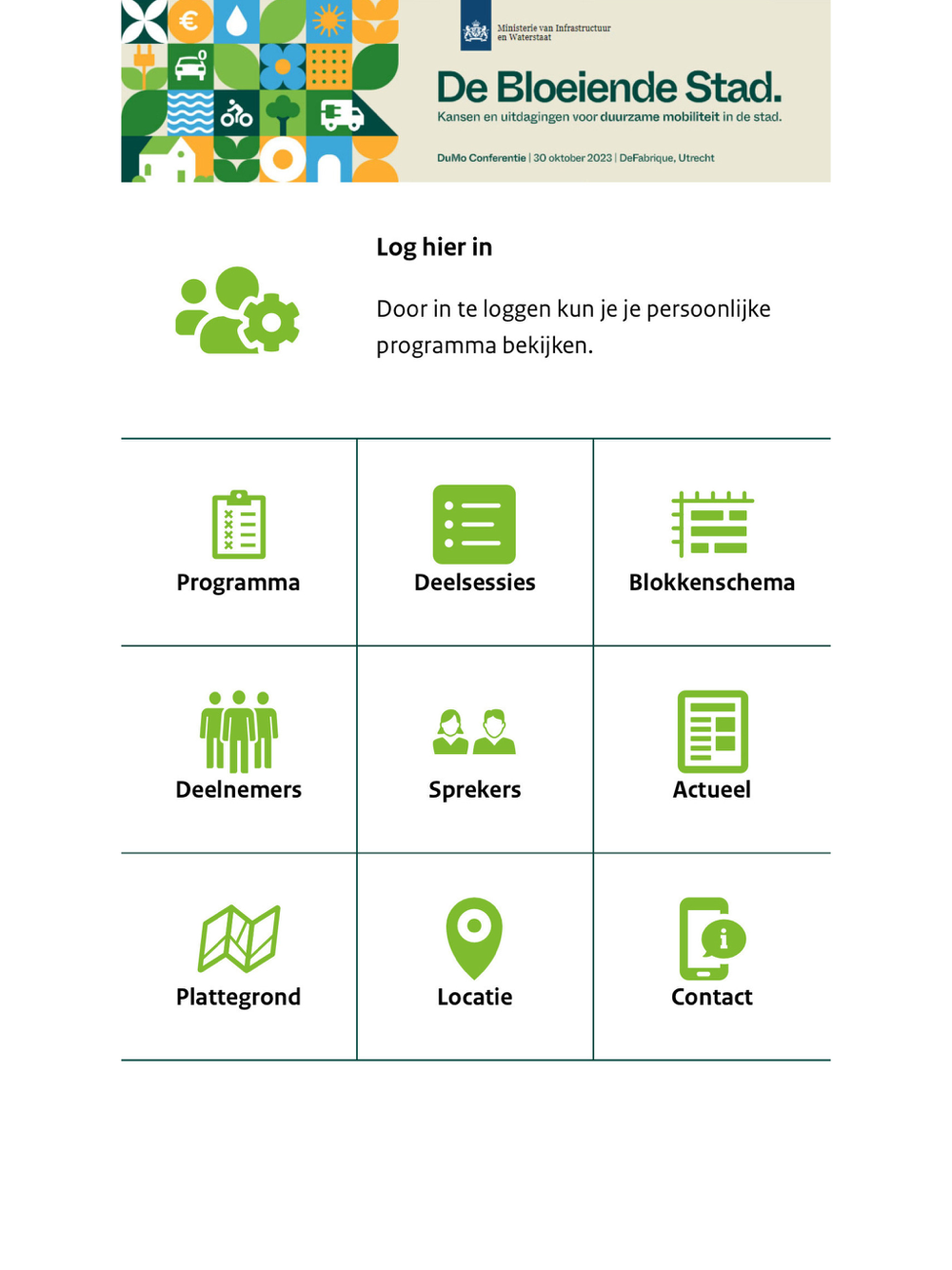 De officiële app voor de Nationale Conferentie Duurzame Mobiliteit op 30 oktober, met alle informatie die belangrijk is tijdens de conferentie. Zoals onder andere: