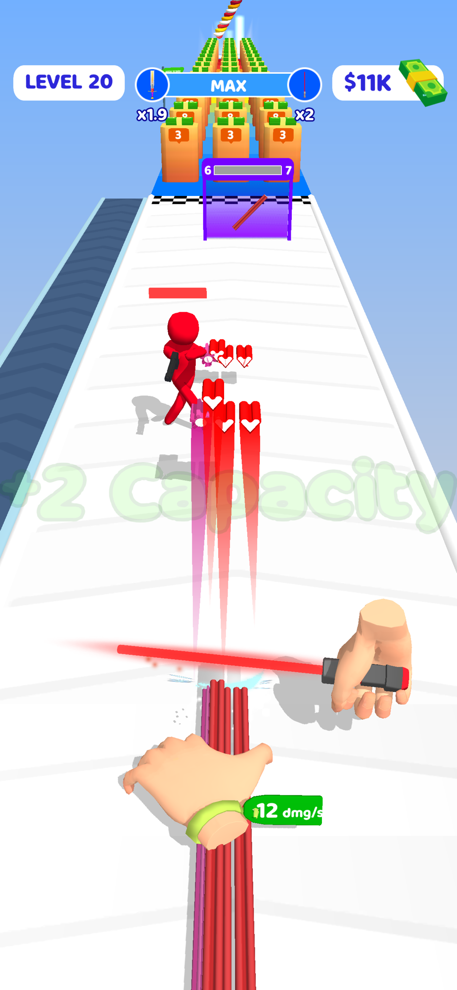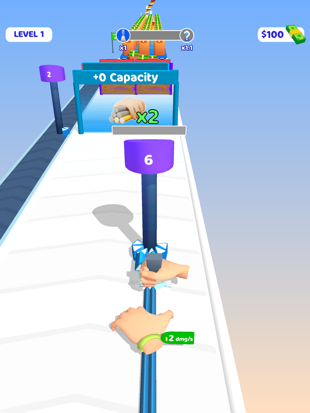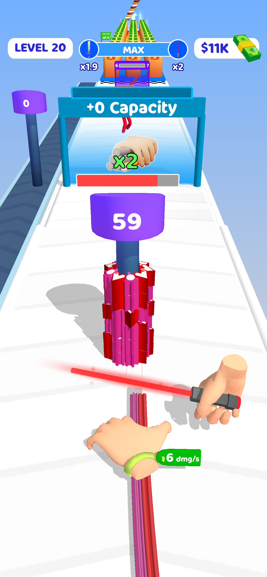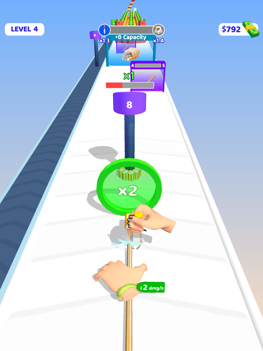 Cut the sticks with a spatula and hit the targets. Align your sticks around the pillar to increase your capacity. As your capacity increases, make multiple shots and destroy more towers to earn more money.