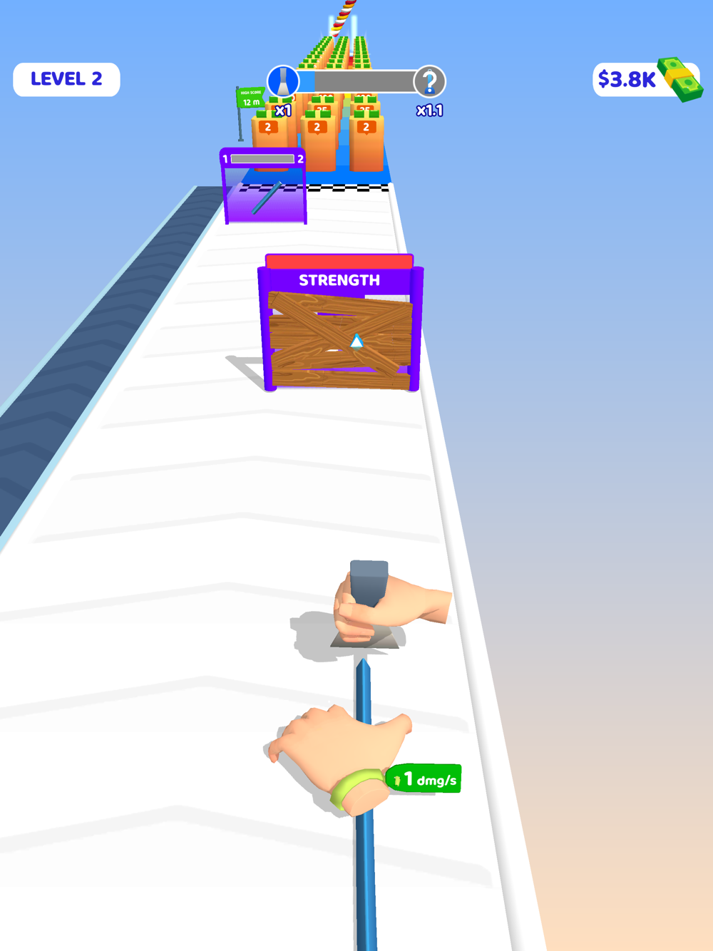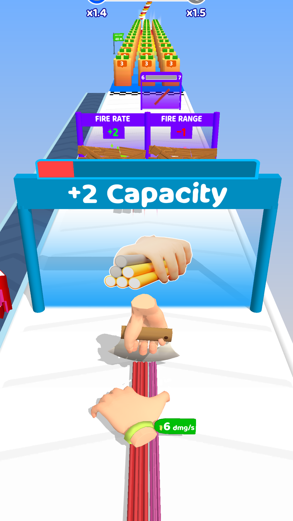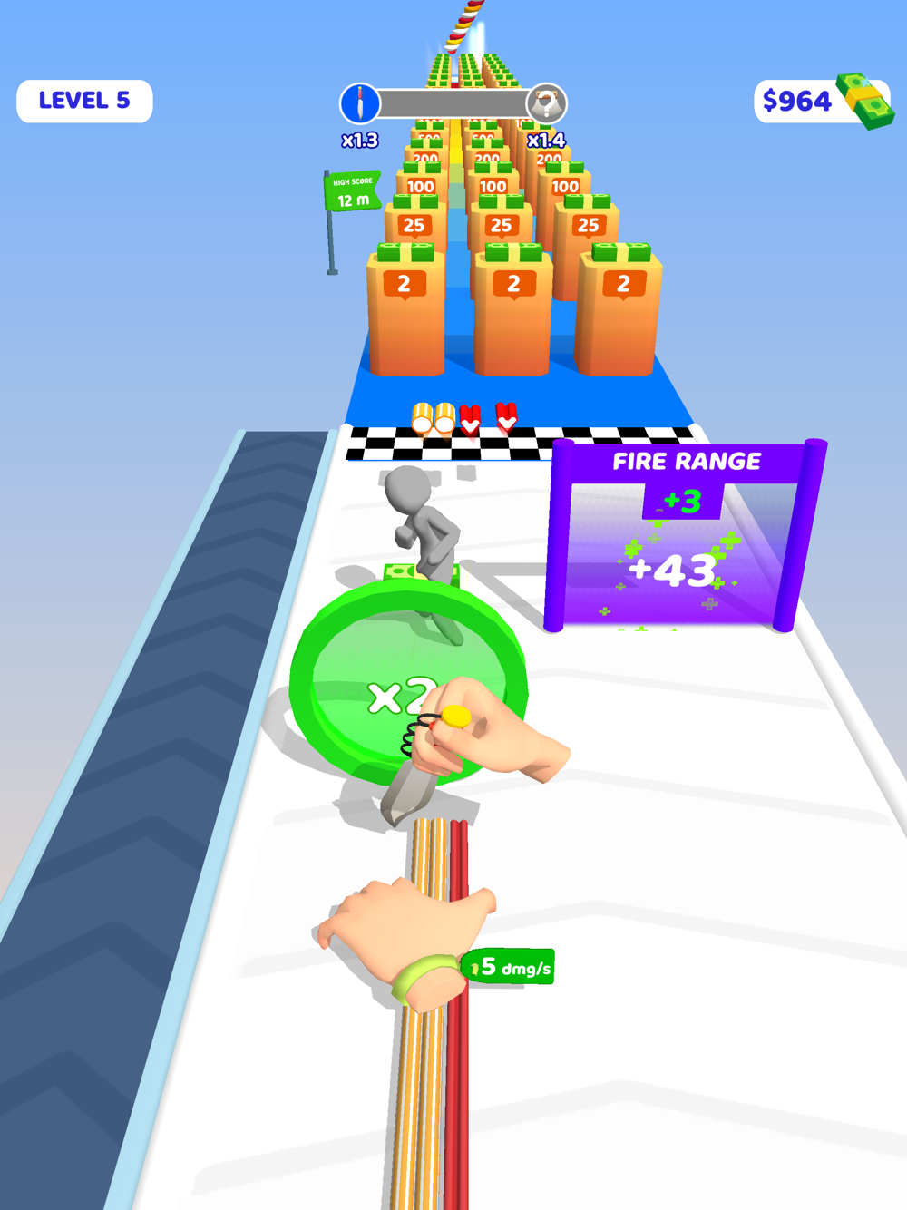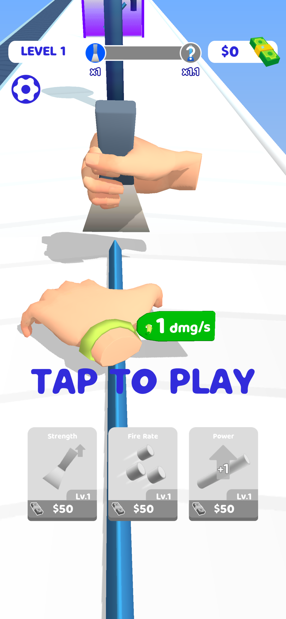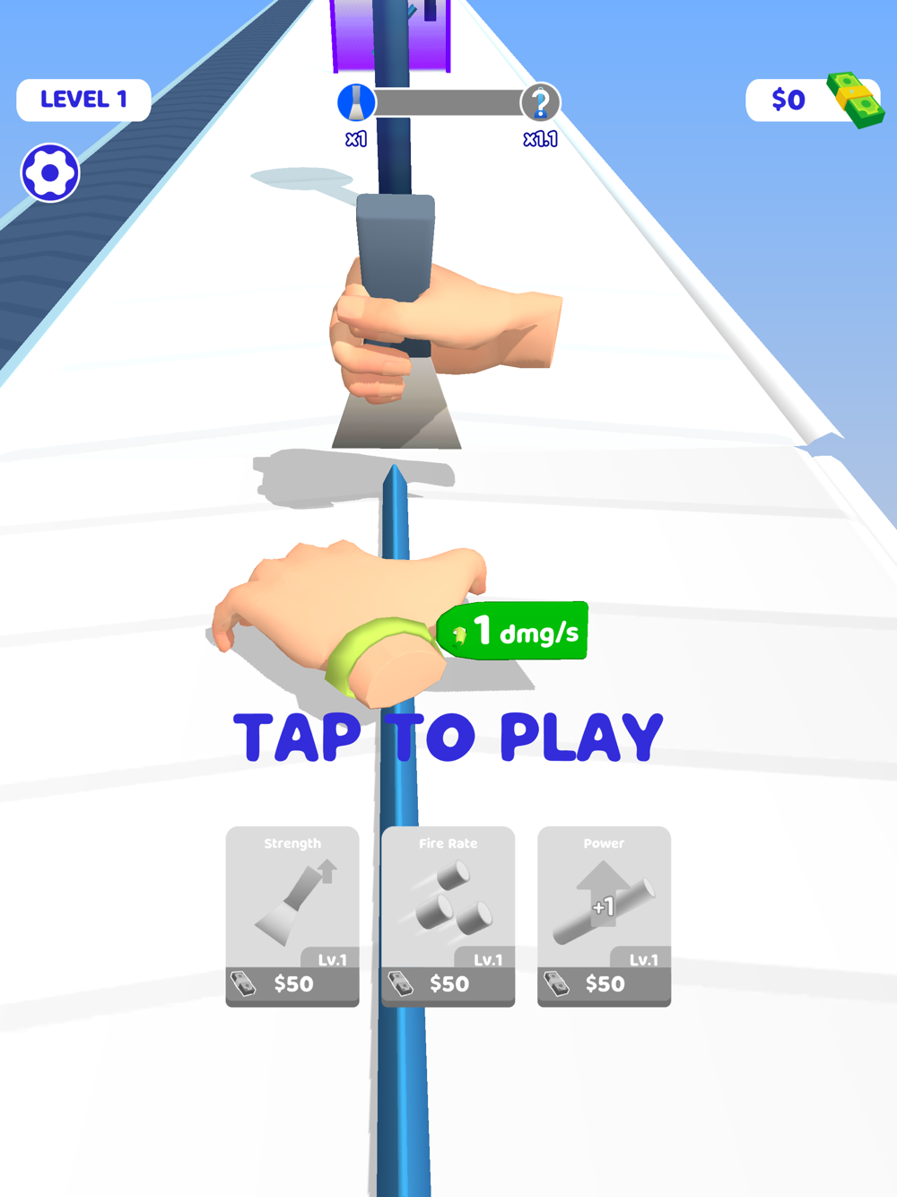 Cut the sticks with a spatula and hit the targets. Align your sticks around the pillar to increase your capacity. As your capacity increases, make multiple shots and destroy more towers to earn more money.