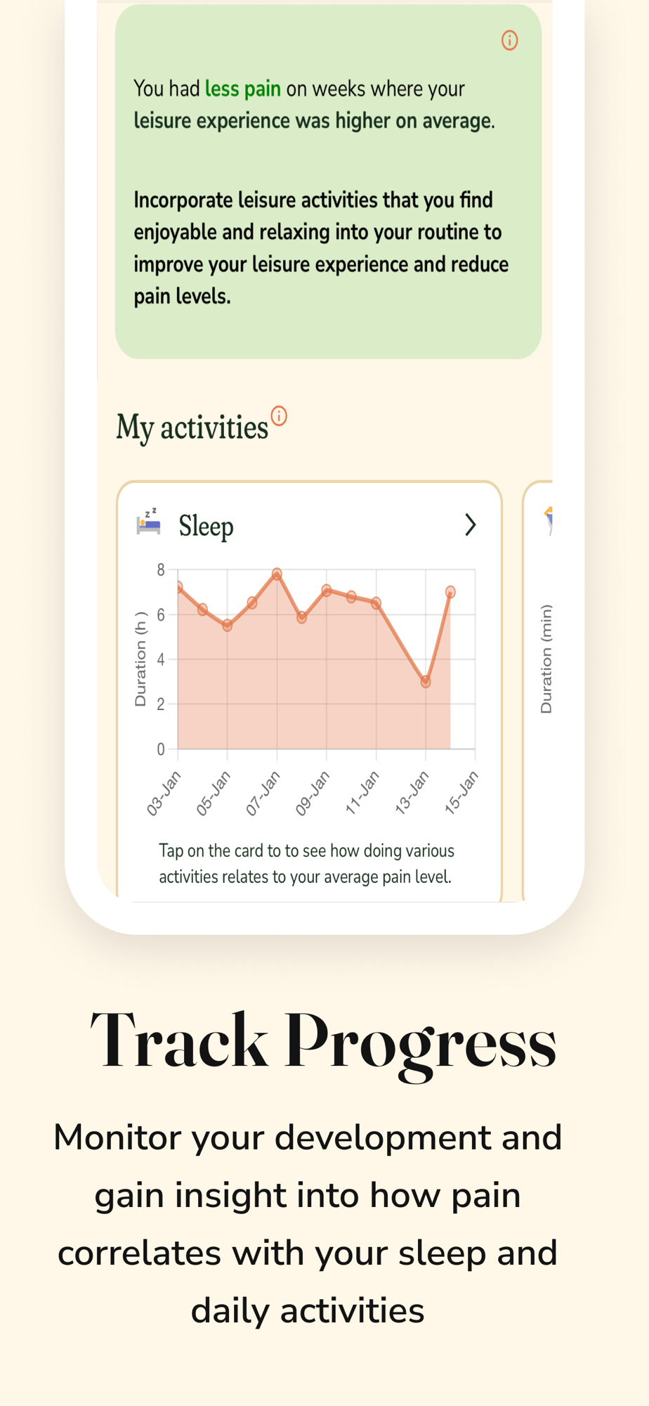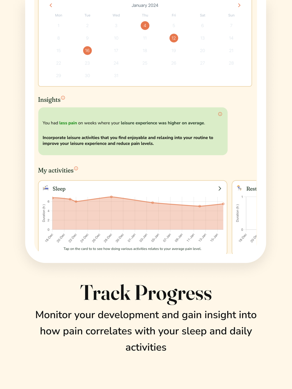 - Improve knowledge: Access short articles on pain management and rehabilitation exercises designed to support your journey, helping you manage the pain for continuous improvement. Engage in daily reflections to better understand variations in your days.