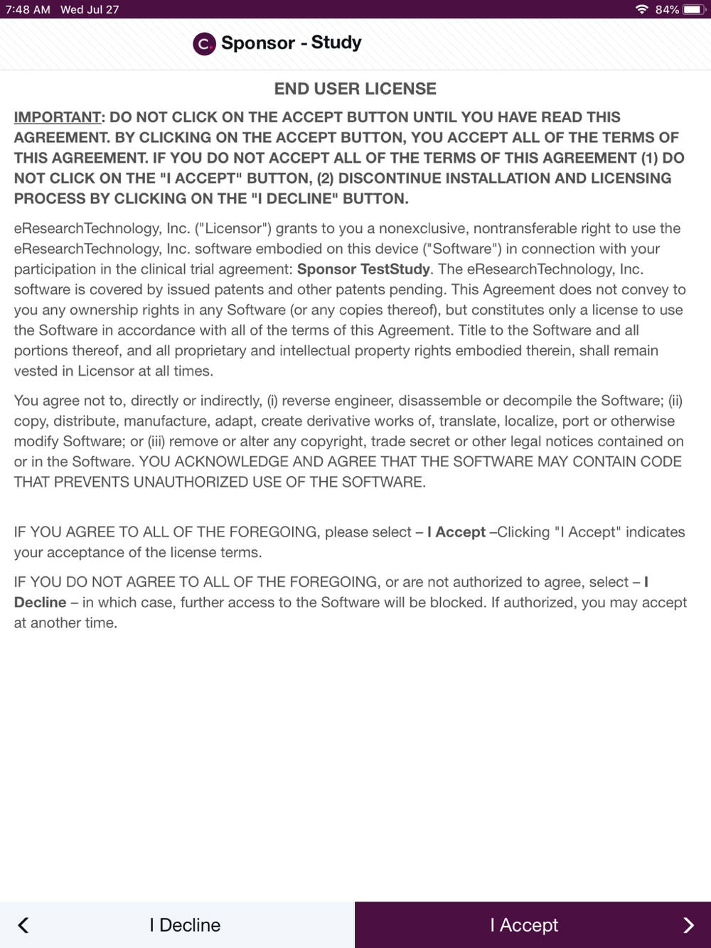 Astellas eCOA App is intended for use of collecting patient reported outcomes relating to the 2693-CL-0310 Study. Patients must be given accounts by a participating site in order to log in to the app