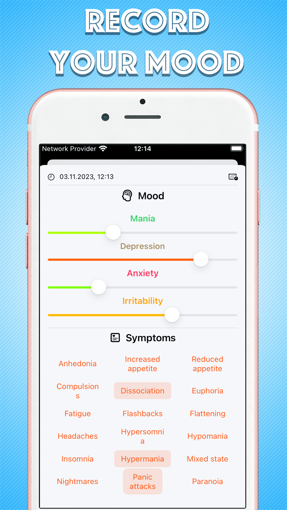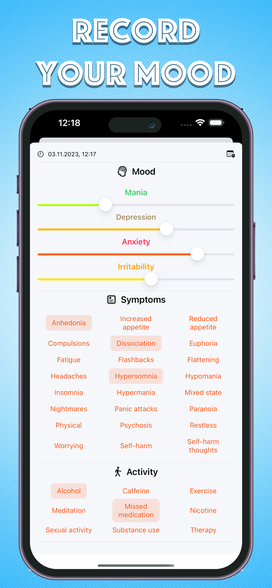 Record your daily levels of mania, depression, anxiety, and irritability within your personal mood diary. This digital journal allows you to monitor your emotional states and track your mental health progress with ease.