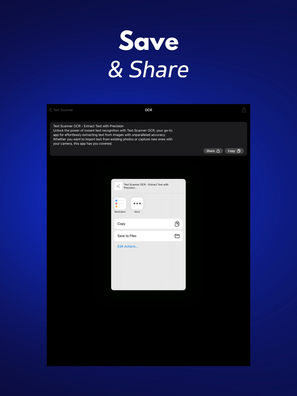 Save, Share and Export: Easily save extracted text, share it with others or export it to your preferred applications for further use. It's the ultimate text processing tool in your pocket.