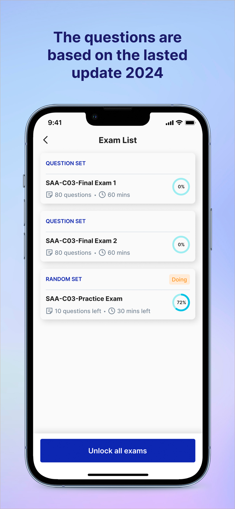 We consistently update our question database with authentic exam content. Regular practice with our AWS exams, aiming for a minimum score of 85%, will prepare you thoroughly for the actual certification exam. Download the AWS SA Exam Simulator now to familiarize yourself with the AWS Certified Solutions Architect Associate (SAA-C03) Exam. Our application is accessible anytime, anywhere, offering flexibility in your exam preparation.