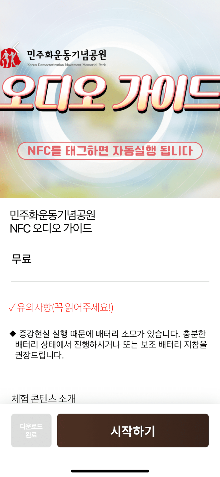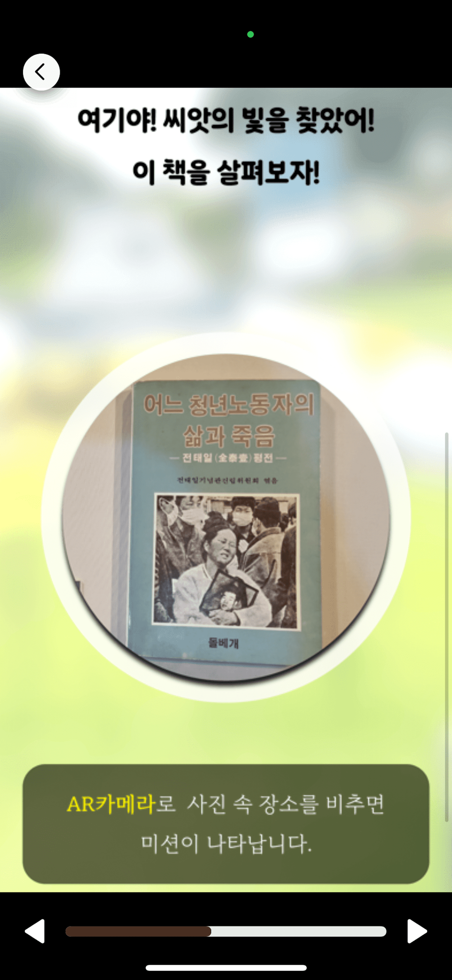 민주화운동기념공원의 전시관 및 야외 묘역 등 다양한 공간을 관람하여 증강현실을 활용해 미션을 해결하는 콘텐츠 서비스입니다.