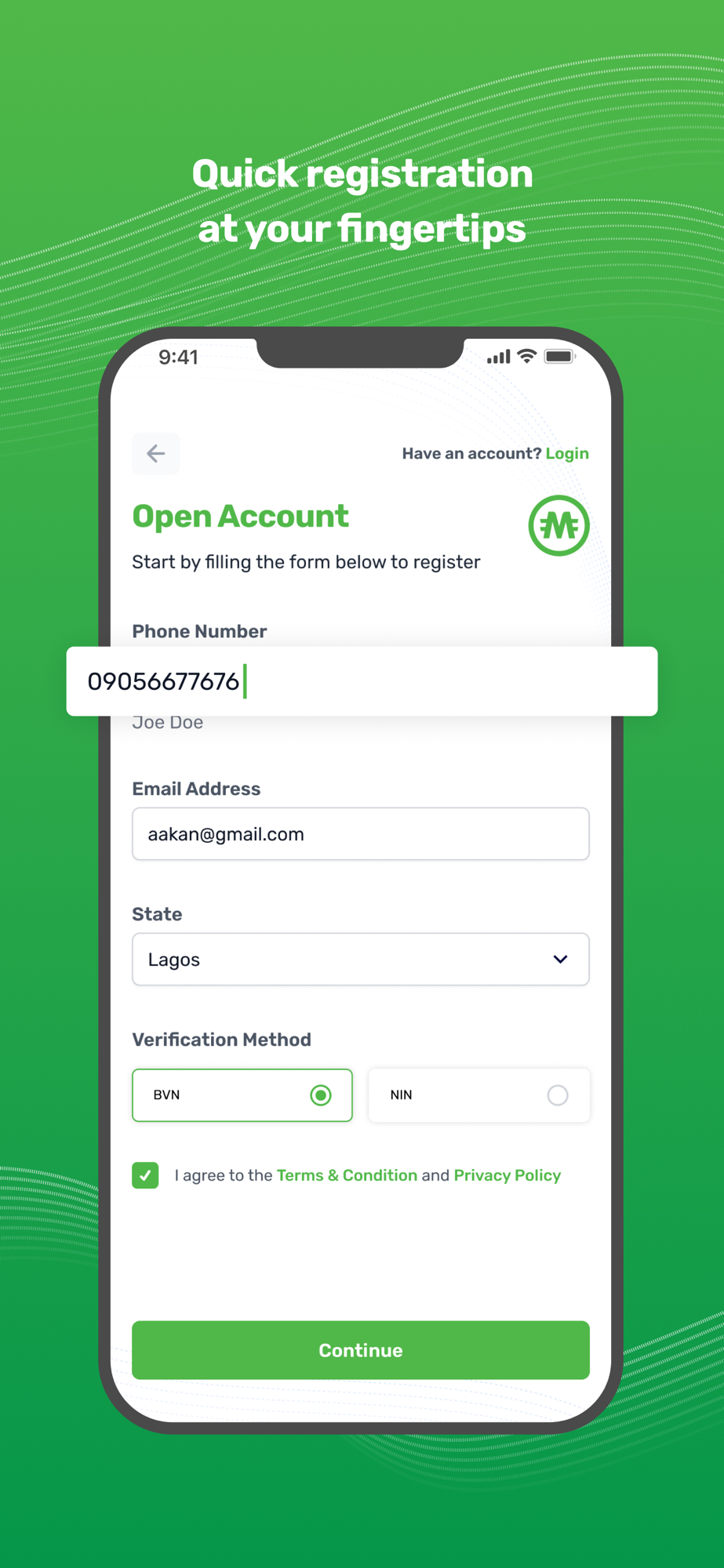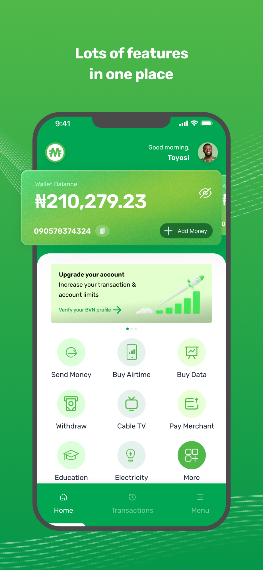 • Glo Customers: You can open a tier-2 mobile wallet without the need for additional validation. After BVN validation, customers from all Mobile Money Operators (MMOs) can open Savings and Current accounts. Savings and Current accounts come with a mobile wallet and default Tier-3 transaction limits. You can customize your transaction limits in the App settings.