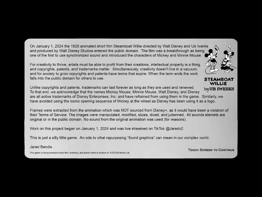 Potato, Potato, Potato is a silly little game designed by Jared Bendis with art by Ub Iwerks. And while Mr. Iwerks died in 1971, a short animated film he made back in 1928 called "Steamboat Willie", which introduced the world to two adorable mouse characters, passed into the public domain on January 1, 2024 and this game uses images and animation from it. The game itself is silly and light, simply cut the potatoes without getting hit in the head! Enjoy.