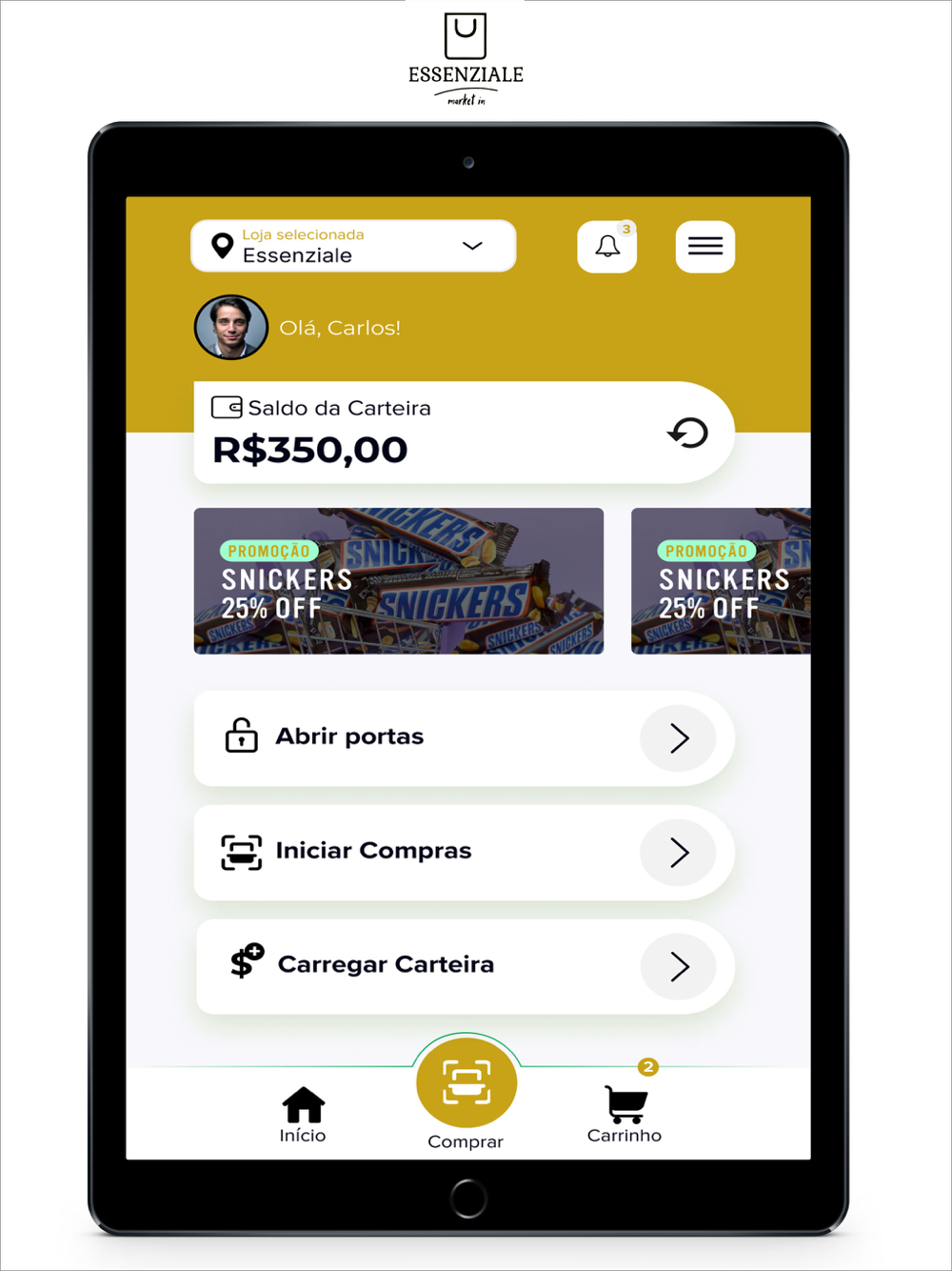 usuários, trazendo o mercado para a palma da sua mão. Levando praticidade e autonomia, esse app tem o objetivo de deixar suas compras ainda mais ágeis e prazerosas. No modelo scan&go, ou seja, bipar através da câmera do seu celular e levar na hora, você desfruta de uma maravilhosa experiência, sem ter que passar pelo caixa evitando, assim, as famosas filas. Venha conhecer a Essenziale Market In e mude o seu jeito de comprar.