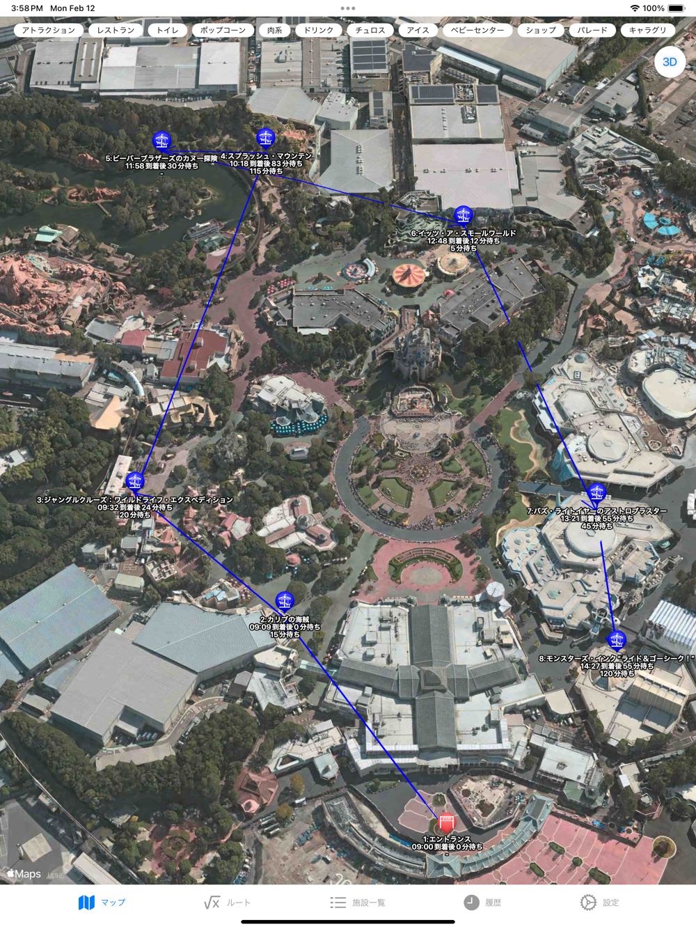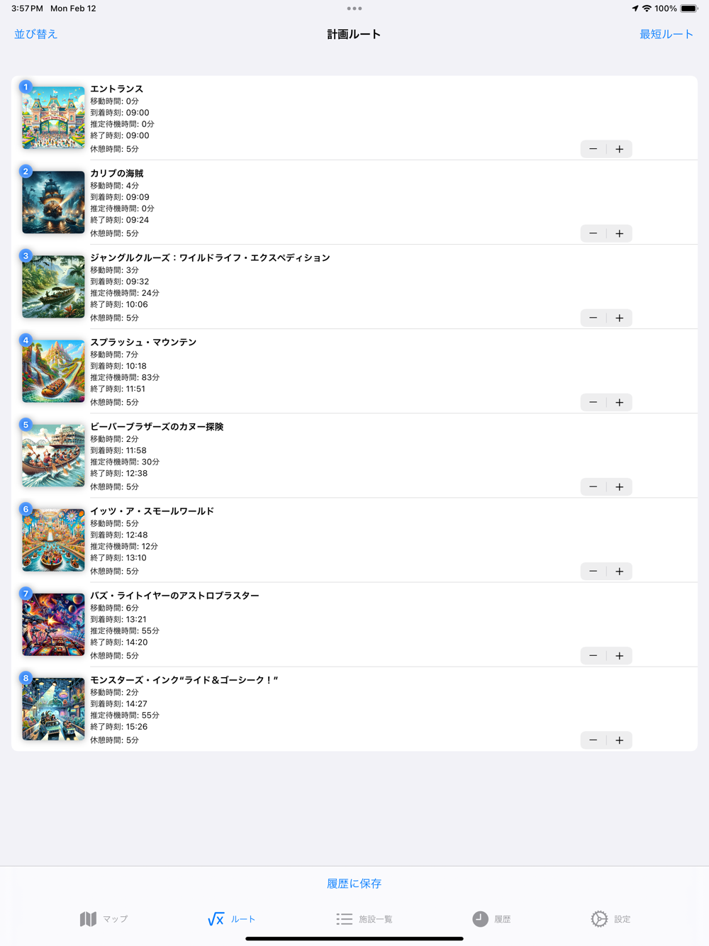 * ルート: AIが提案するルートを確認・編集。計画に沿ってアトラクションを楽しめます。