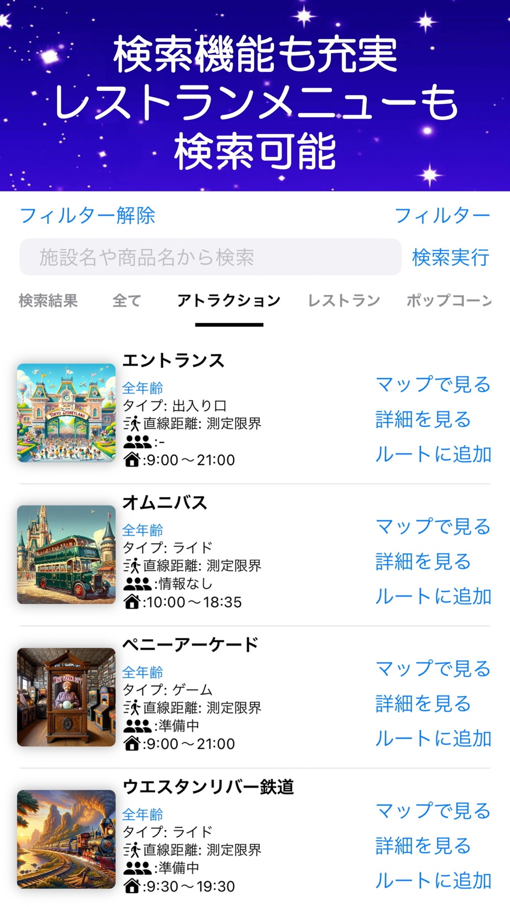 * フィルター機能: 身長制限やカテゴリーでアトラクションを絞り込み。検索も可能。