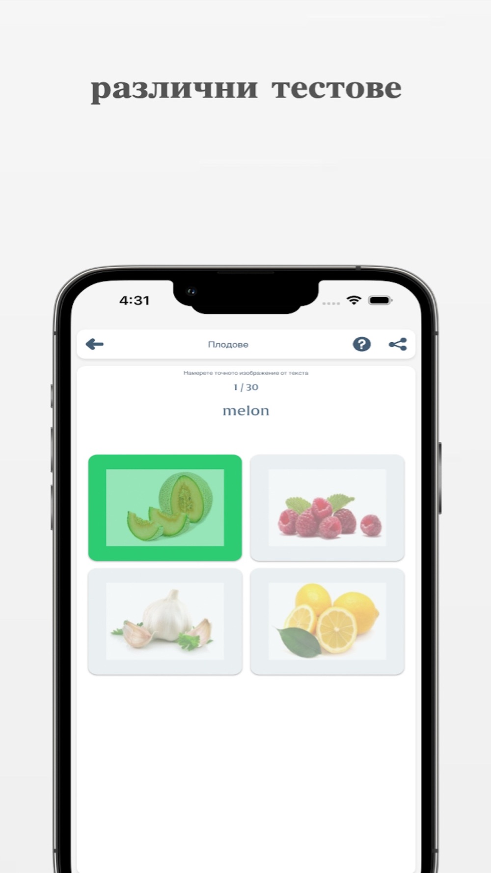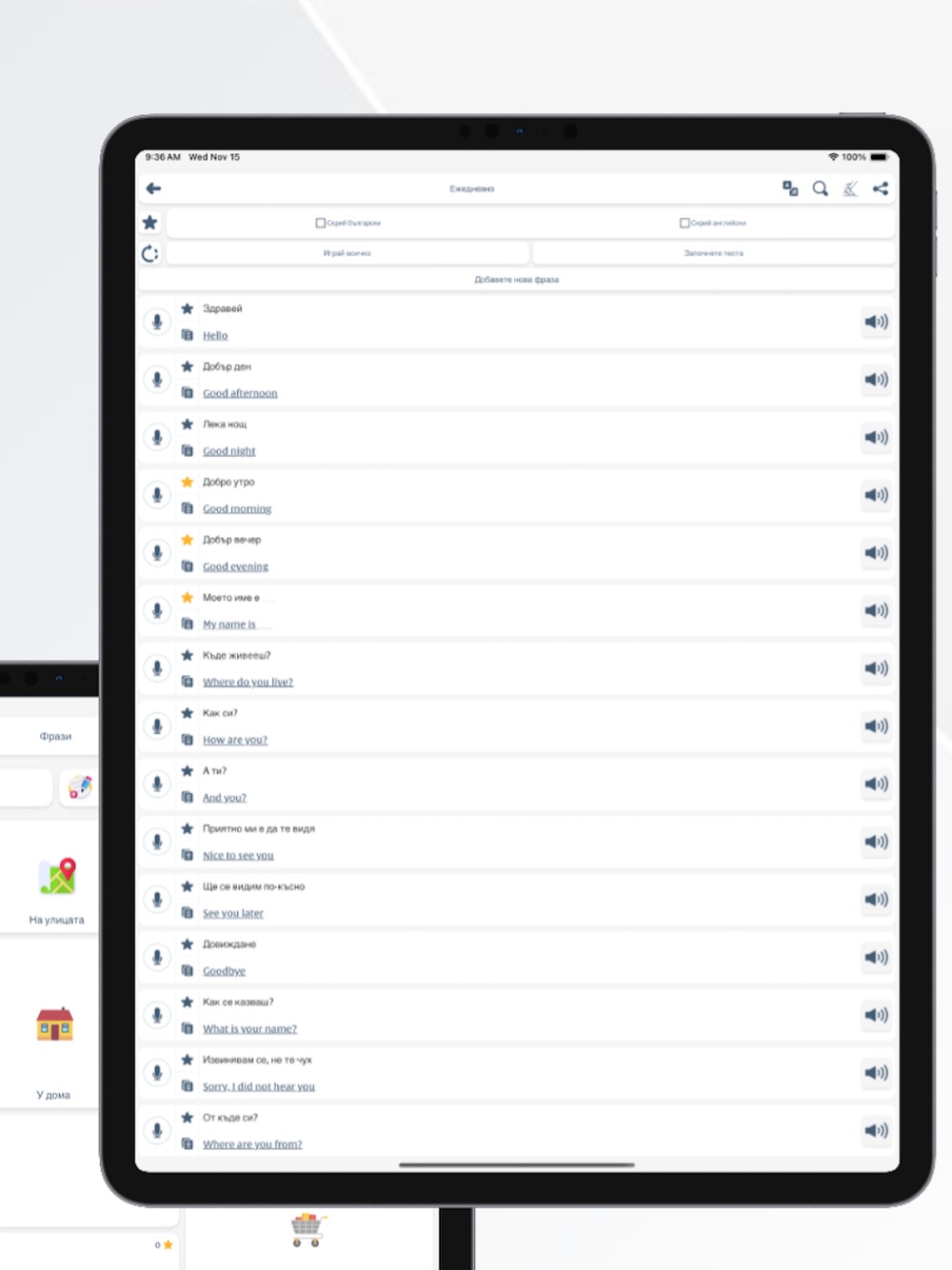 Предизвикайте себе си с различни тестове като съвпадение на думи, превод, слушане с разбиране и произношение. Тези тестове ви помагат да проследявате напредъка и да затвърждавате знанията си.