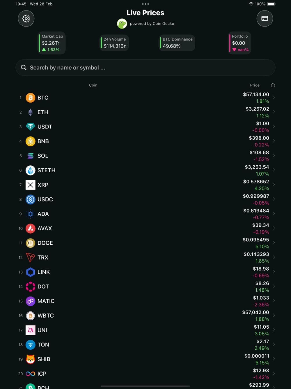 투자 추적: 암호화폐 보유를 쉽게 관리하세요. 좋아하는 코인을 추가하고 그들의 성능을 한 곳에서 모니터링하세요.
