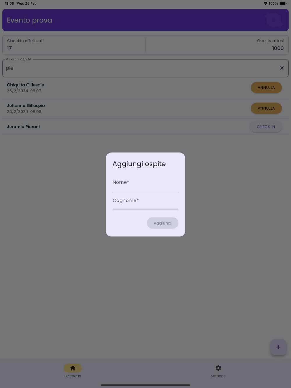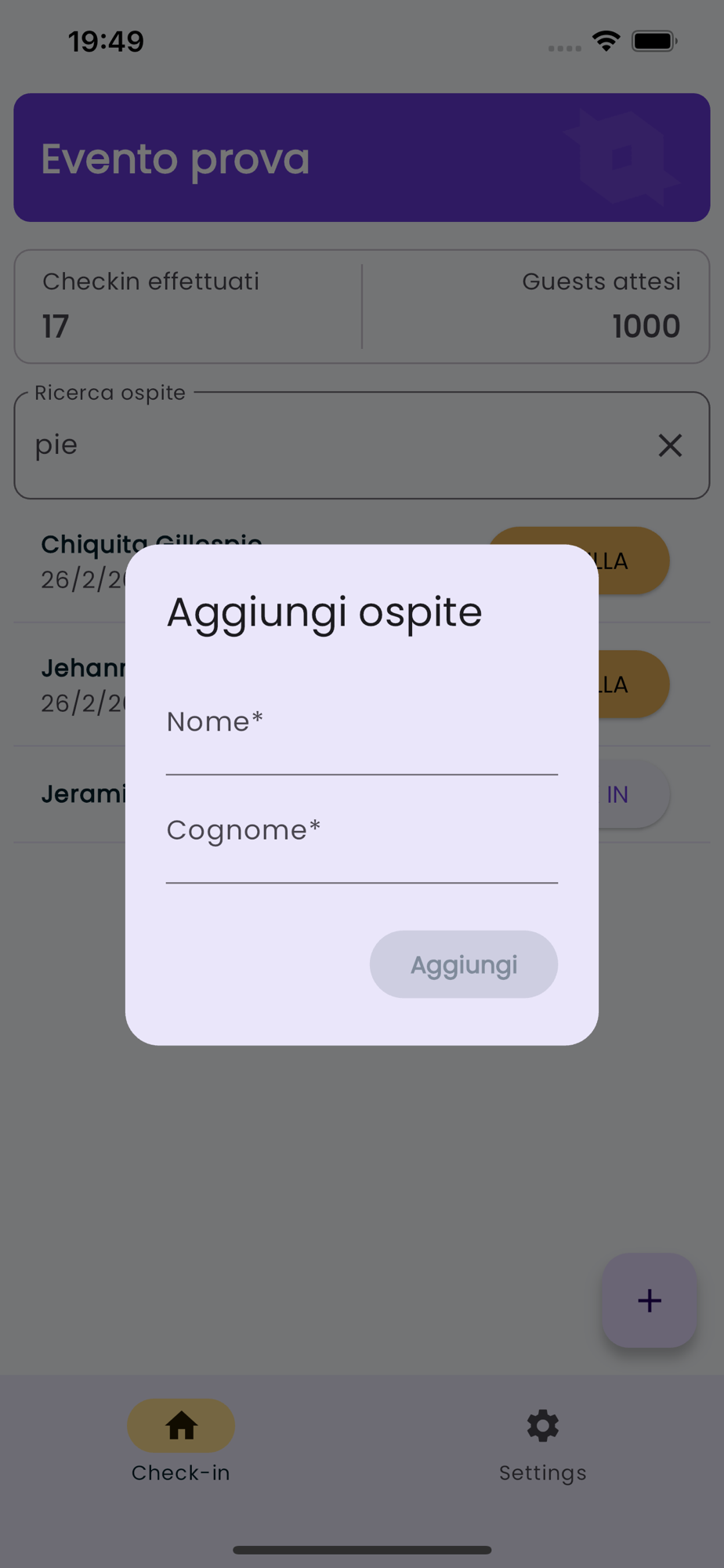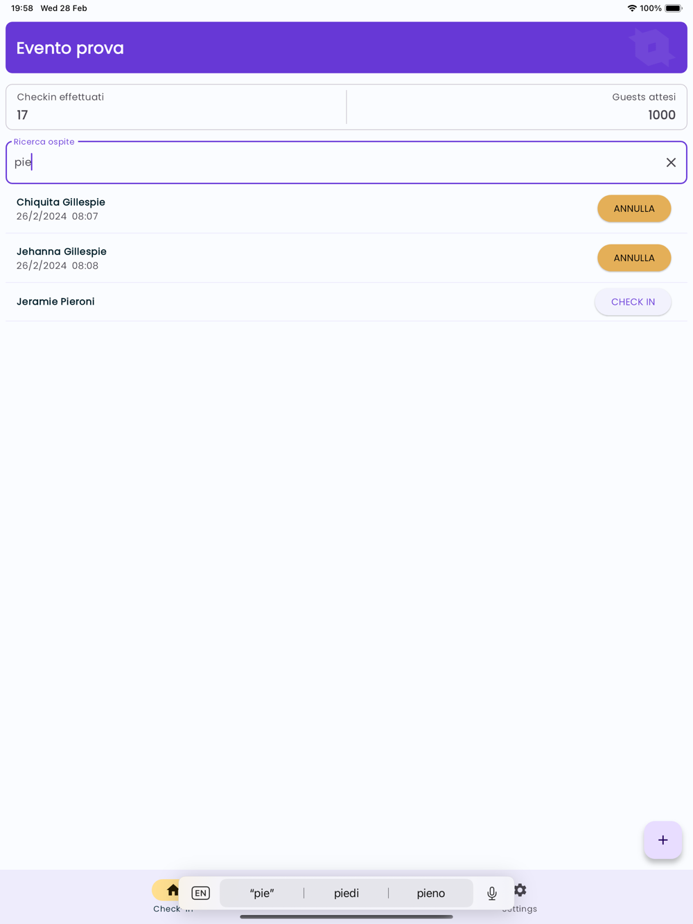 Crea il tuo evento in un click su app.realguest.it, aggiungi i tuoi campi personalizzati se ne hai bisogno e gestisci le tue liste ospiti fino al giorno dell'evento. Tramite la nuova app potrai scegliere la modalità di check-in nel giorno dell’evento tra quelle disponibili: semplice ricerca per nome/cognome, Qr code via Mail o Qr code via SMS!