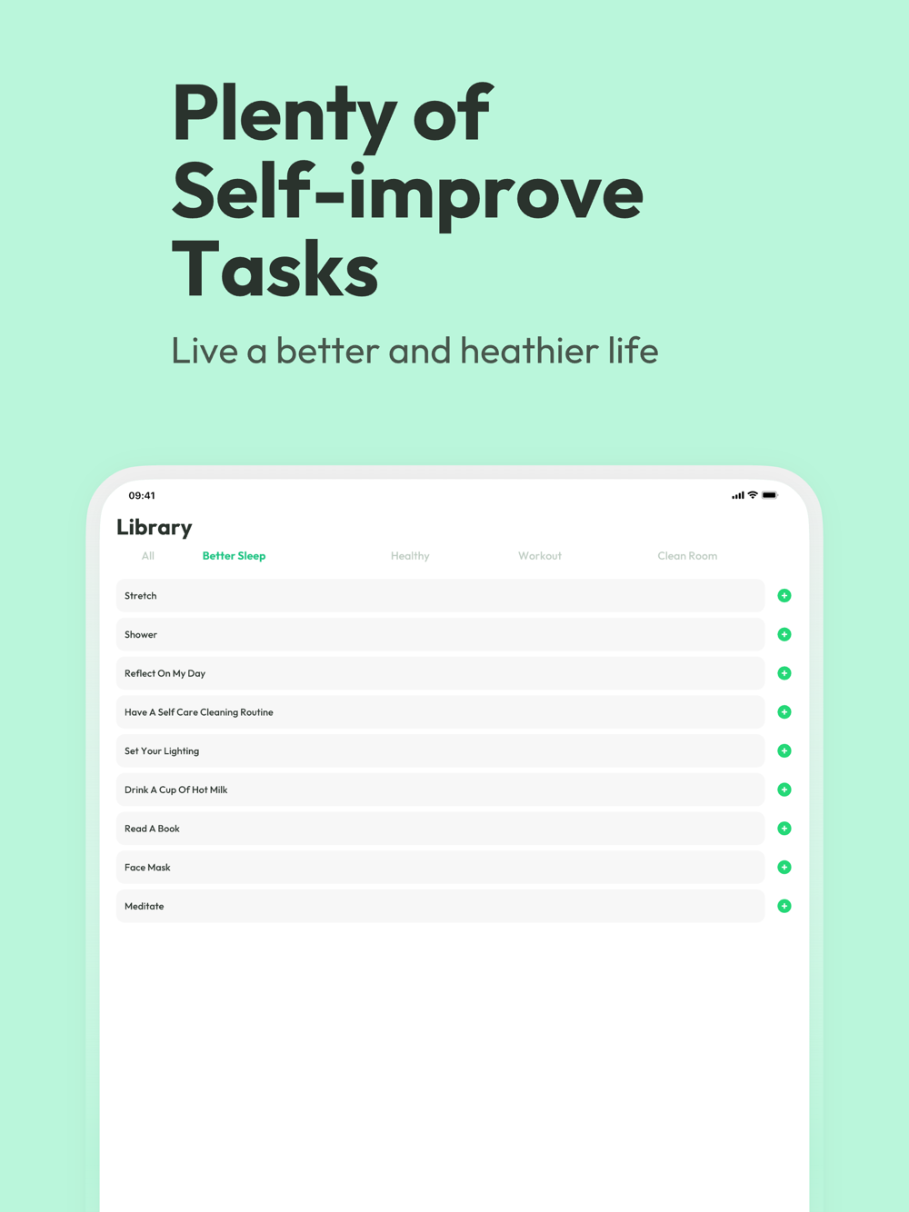 Add some good habits from our library tab, like better sleep, exercise, reading or cleaning room etc. Follow the routines to develop good habits easily and feel the everyday change at the end of the day.