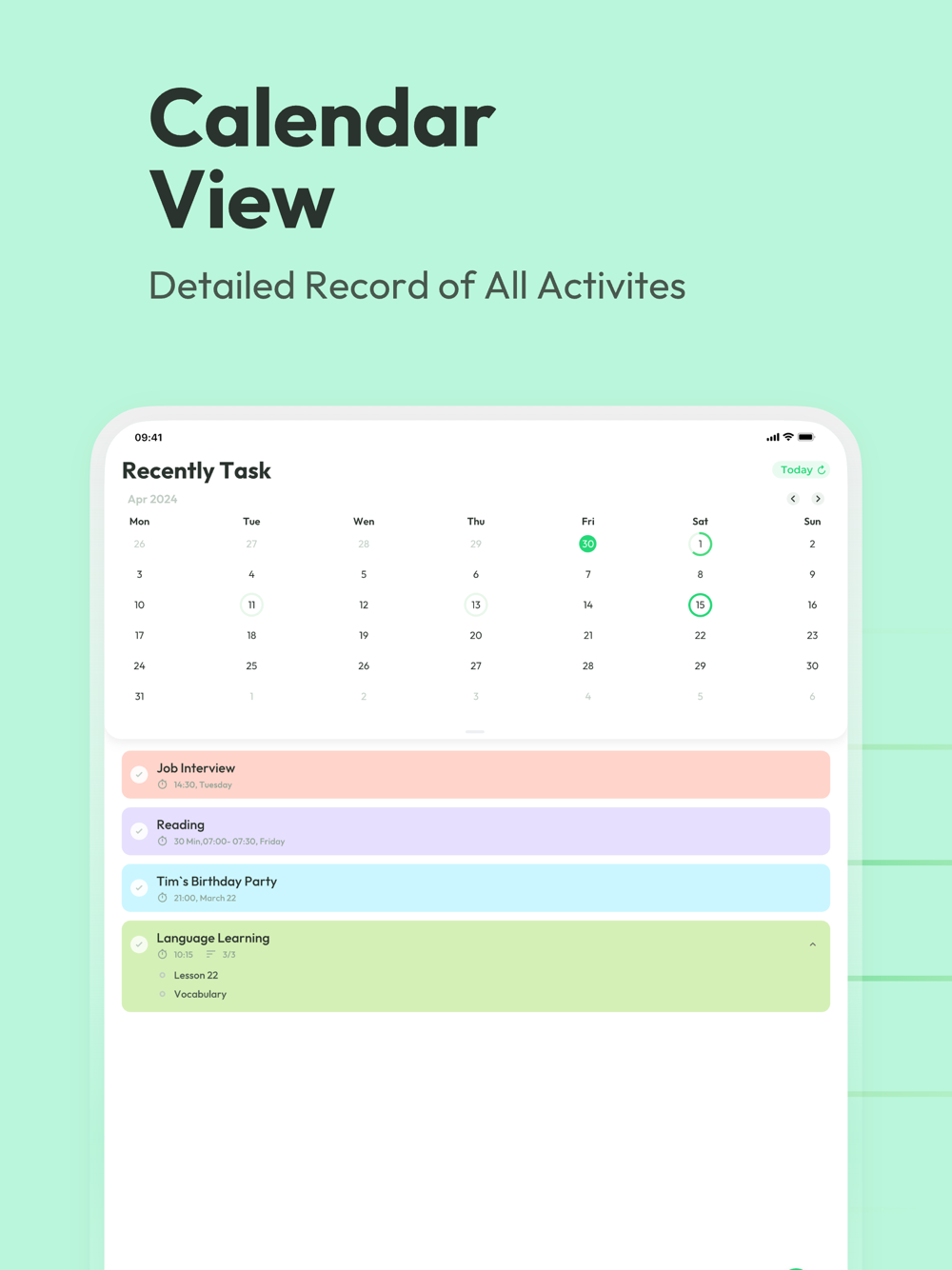 Gain a comprehensive overview of your schedule with the calendar view. Easily manage your tasks and appointments in a simple, clear and organized interface.