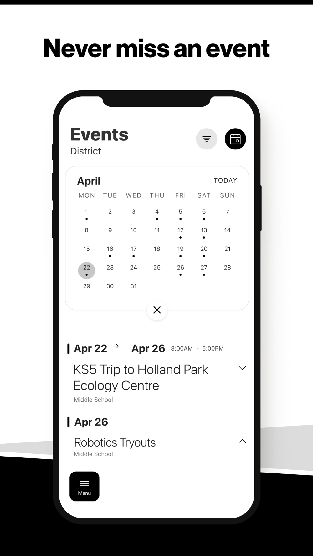 The event section shows a list of events throughout the district. Users can add an event to their calendar and share the event with friends and family with one tap.