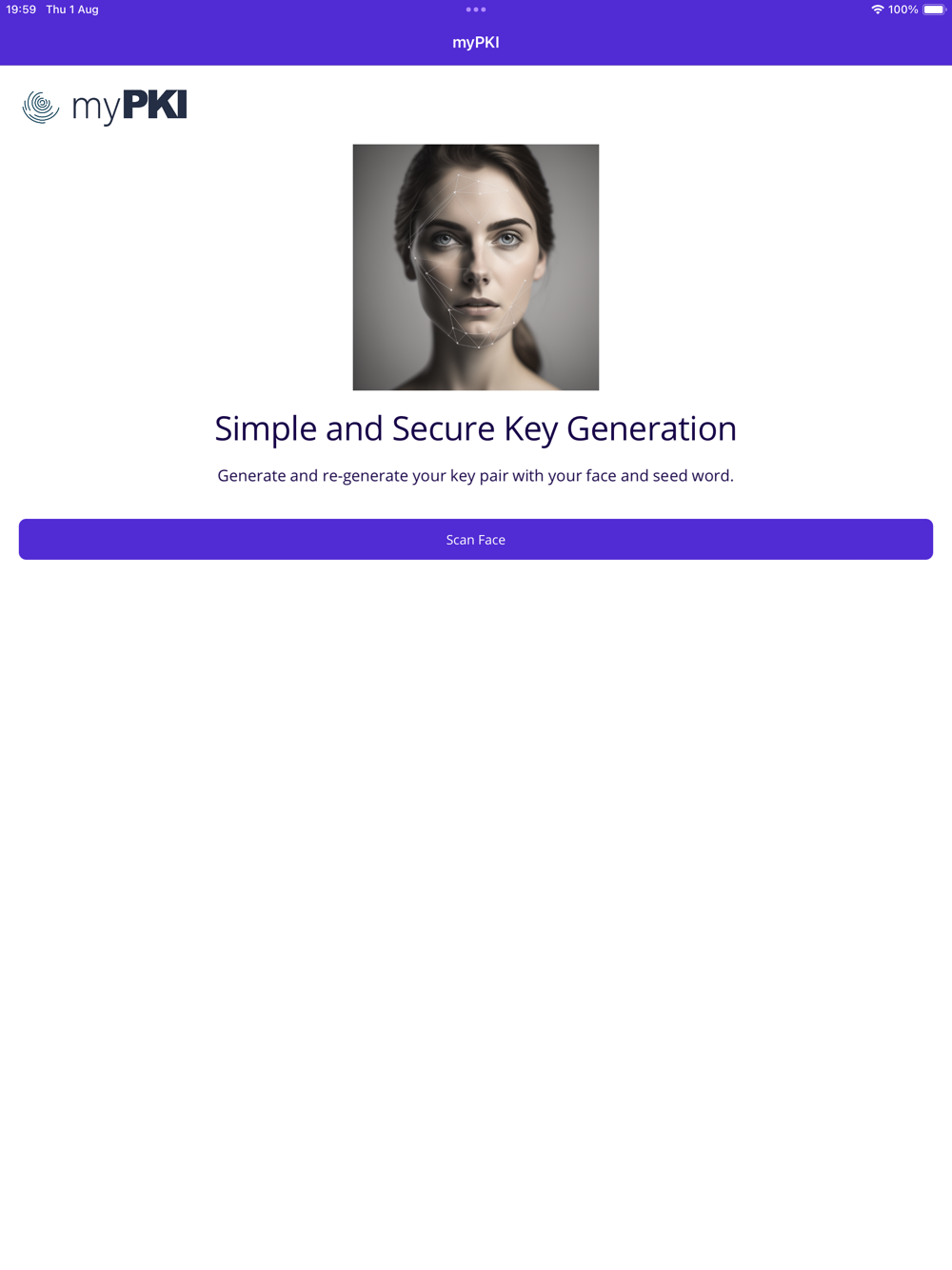 myPKI is a unique way of generating and regenerating your public and private key pair using your face. With myPKI there is no centralised storage or identity verification. The solution creates a stable seed using your face and allows you to create, use and recreate keys for everyday use.