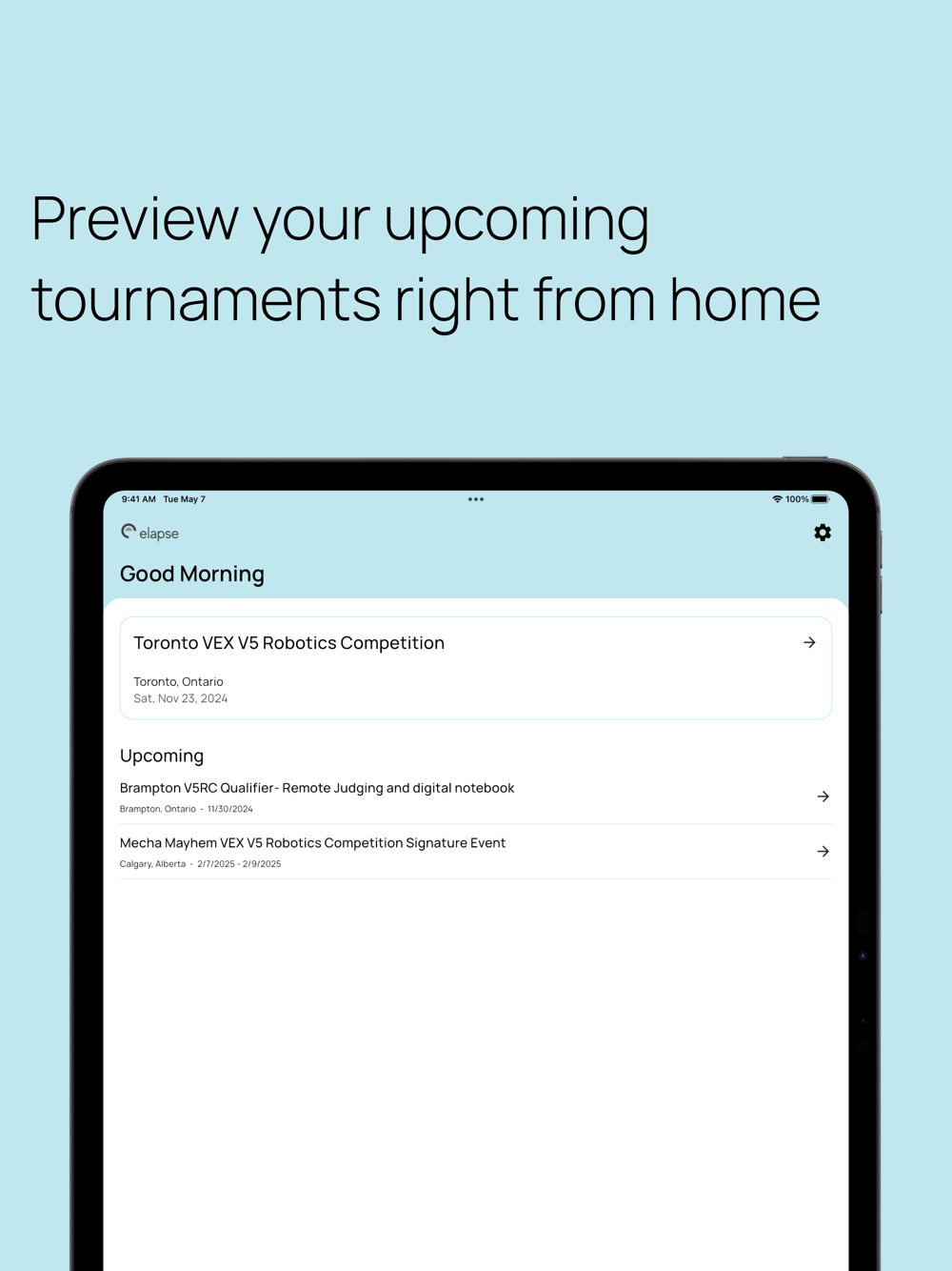 Elevate your V5RC experience using Elapse. Building on the functionality of existing applications, Elapse adds a level of individual personalization not yet seen before in previous Vex Robotics applications. View your upcoming matches with ease using tournament mode, and share detailed scouting reports with your teammates using ScoutSheets. Elapse is your one stop shop for everything related to V5RC tournaments.