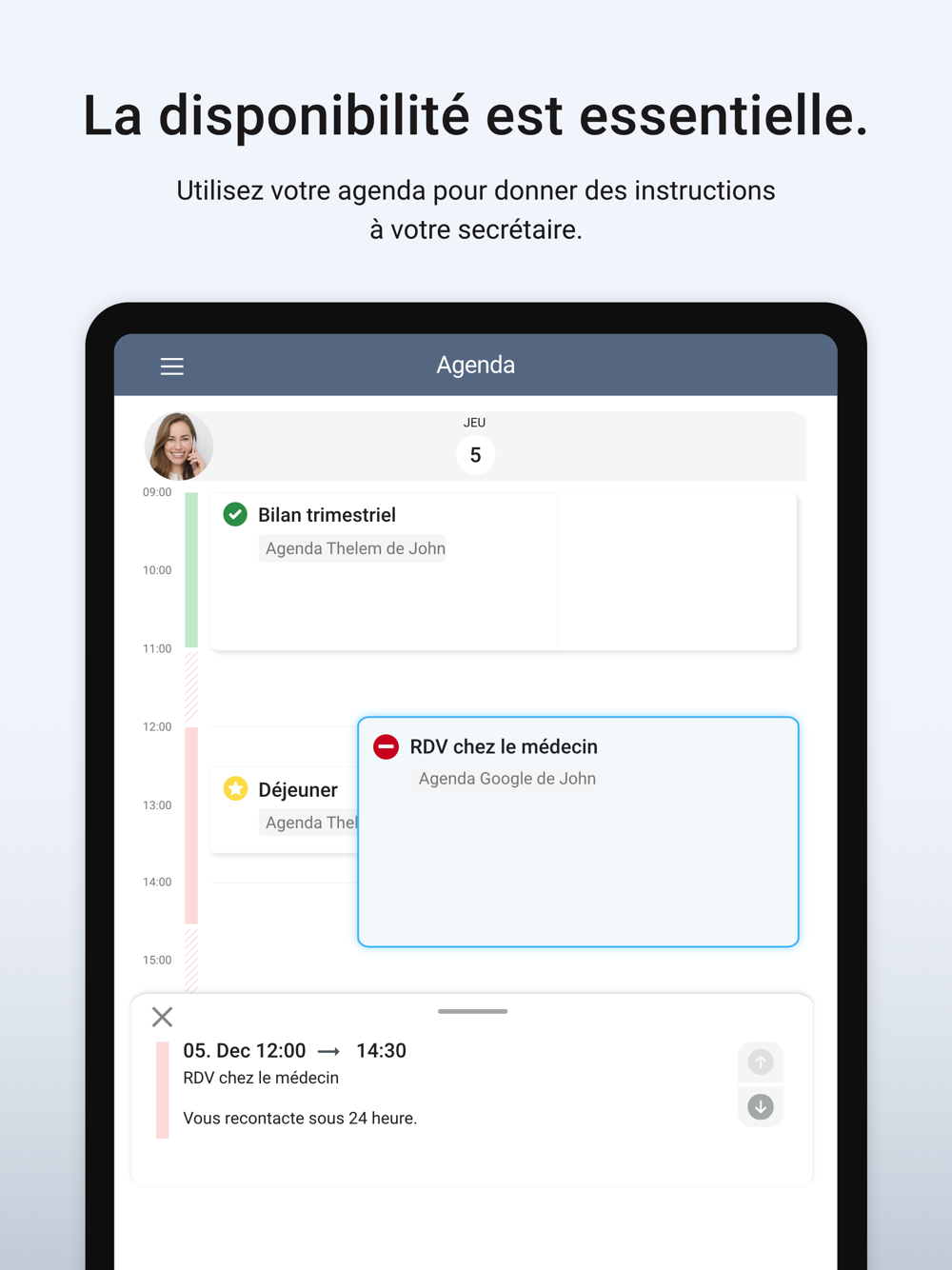 - Ajuster facilement votre disponibilité et votre motif d’absence.