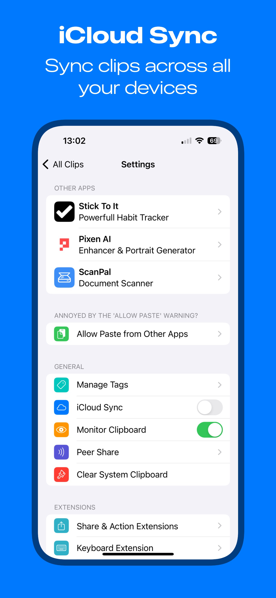 iCloud Sync: Keep your clips in sync across all your Apple devices.