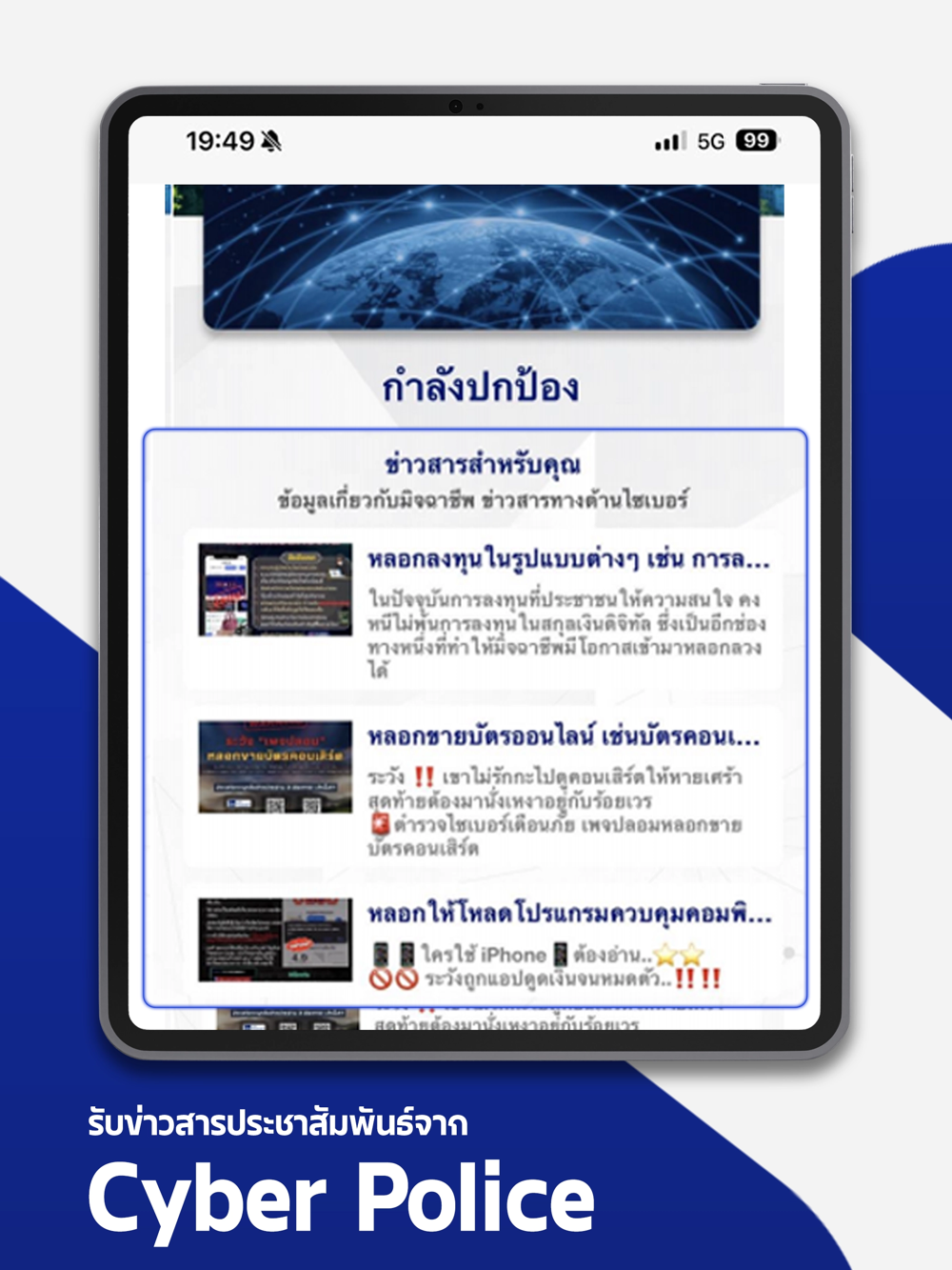 เราไม่สามารถเข้าถึงข้อมูลส่วนบุคคลของคุณ ทั้งหมายเลขโทรศัพท์, sms และข้อมูลเกี่ยวกับกิจกรรมโทร, กิจกรรมการรับ, ส่ง sms ของคุณ แต่จะมีข้อมูลจากฐานข้อมูลตำรวจ cyber ช่วยผู้ใช้ในเรื่องดังต่อไปนี้ (เมื่อผู้ใช้เปิดการใช้งาน funtion ที่เกี่ยงข้องและอับเดทฐานข้อมูล)