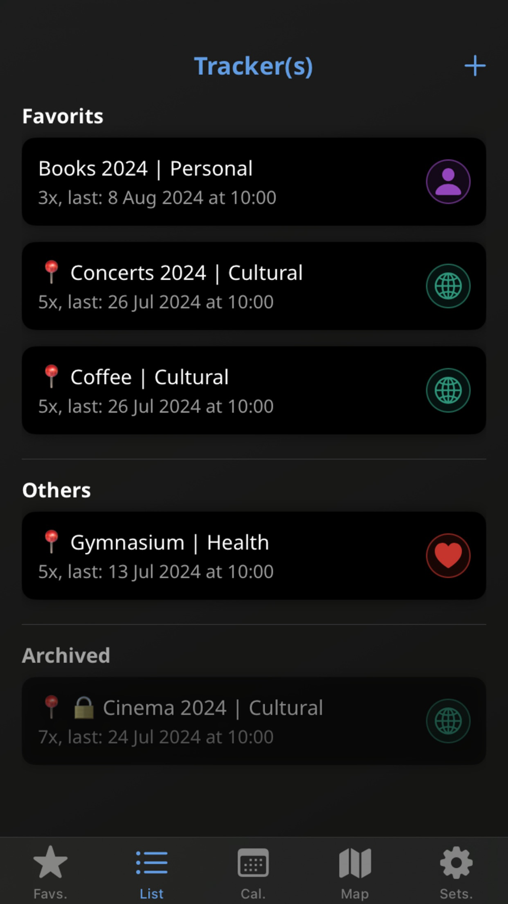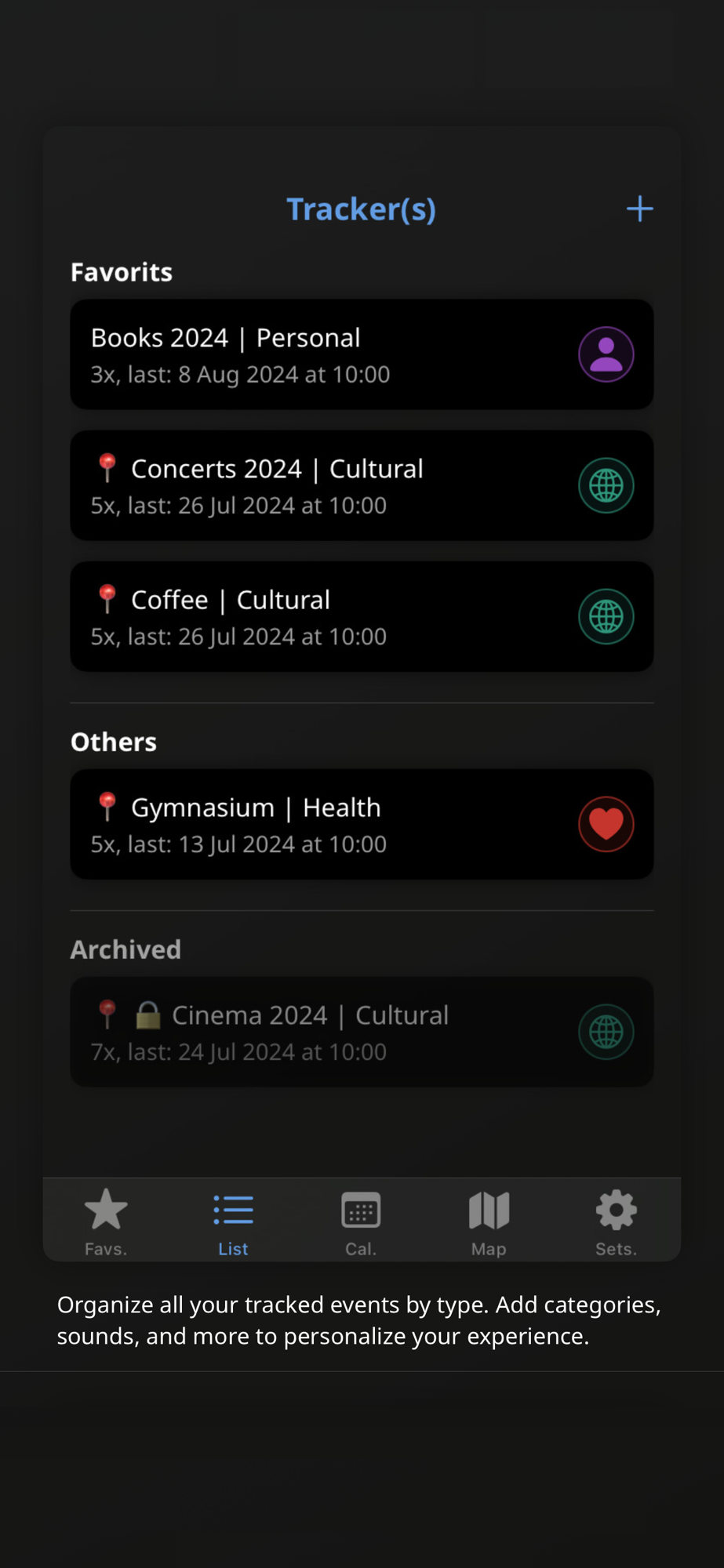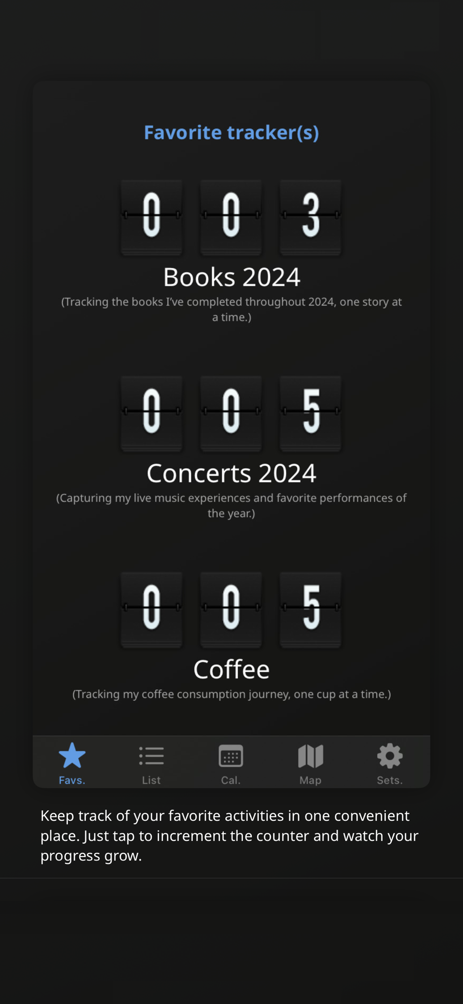 - Favorites Tracker: Quickly add your favorite activities, from movies to workouts, and see the numbers grow.