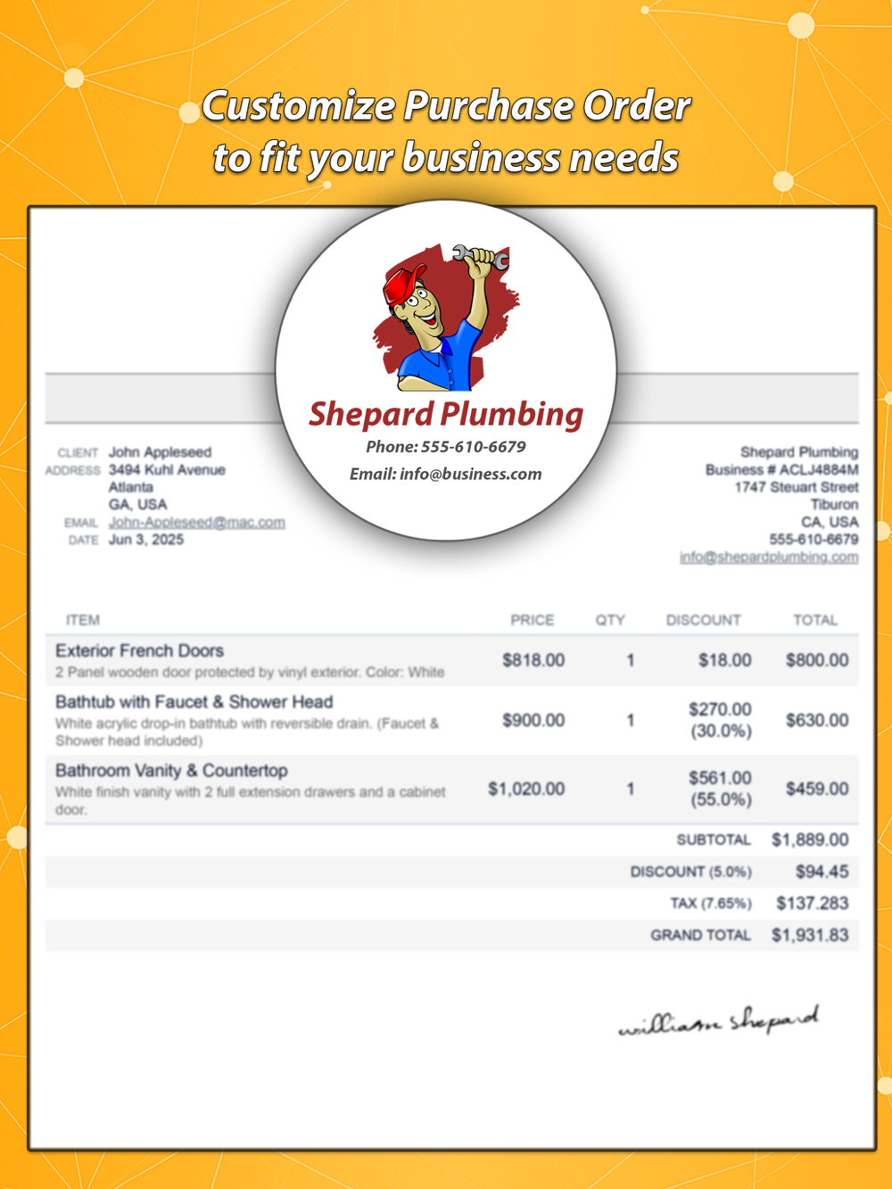 Design stunning purchase orders using sleek, professional templates and a wide range of customization options. Add essential details such as shipping charges, taxes, discounts, expiry dates, and more. Easily sign and send your purchase orders directly from your device.