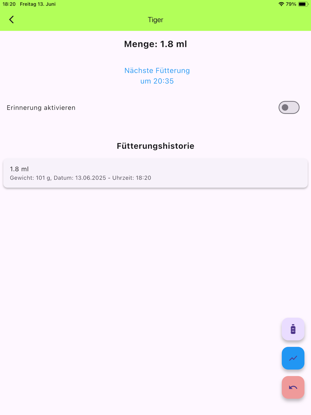 Zusätzlich erinnert die App zur Fütterungszeit und ein Protokoll über die Fütterung wird angelegt. Über ein Diagramm kann der Gewichtsverlauf visualisiert werden.