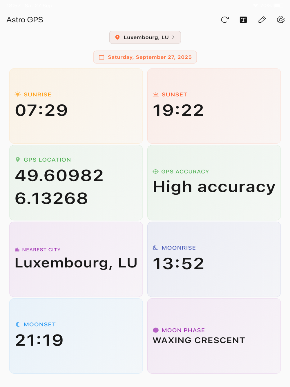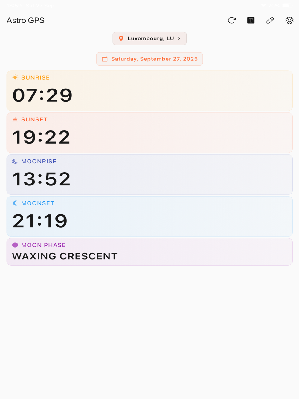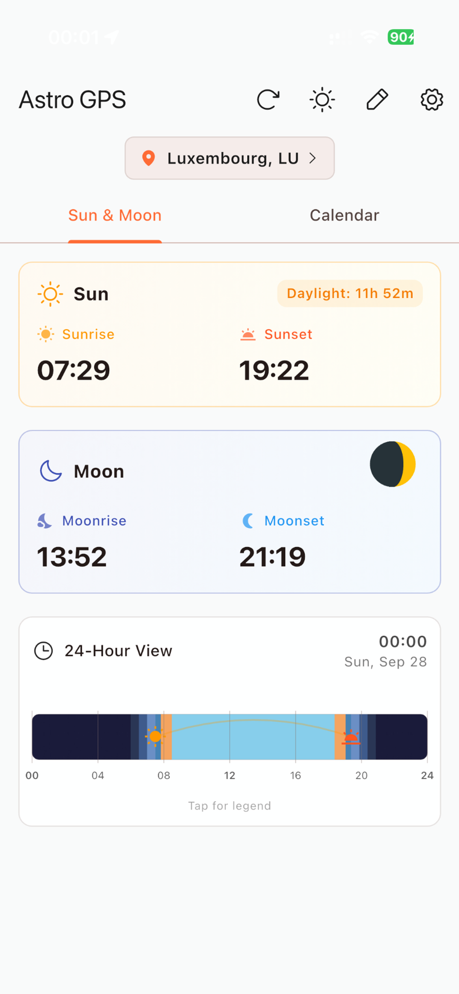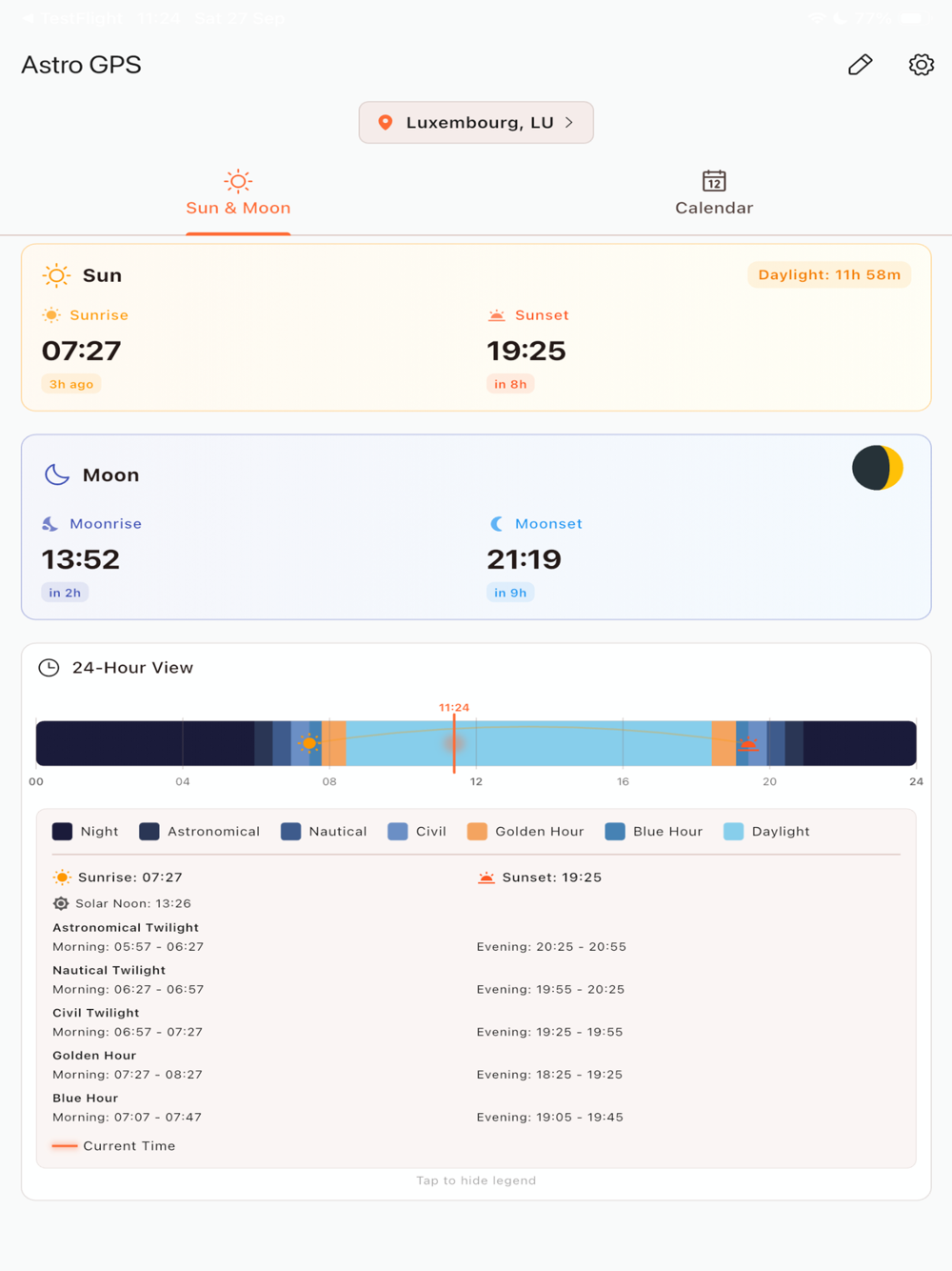 Whether you're planning a multi-day trek, capturing the perfect landscape photo, or simply want to know when the sun sets at your destination, Astro GPS provides accurate, reliable astronomical information exactly when and where you need it.
