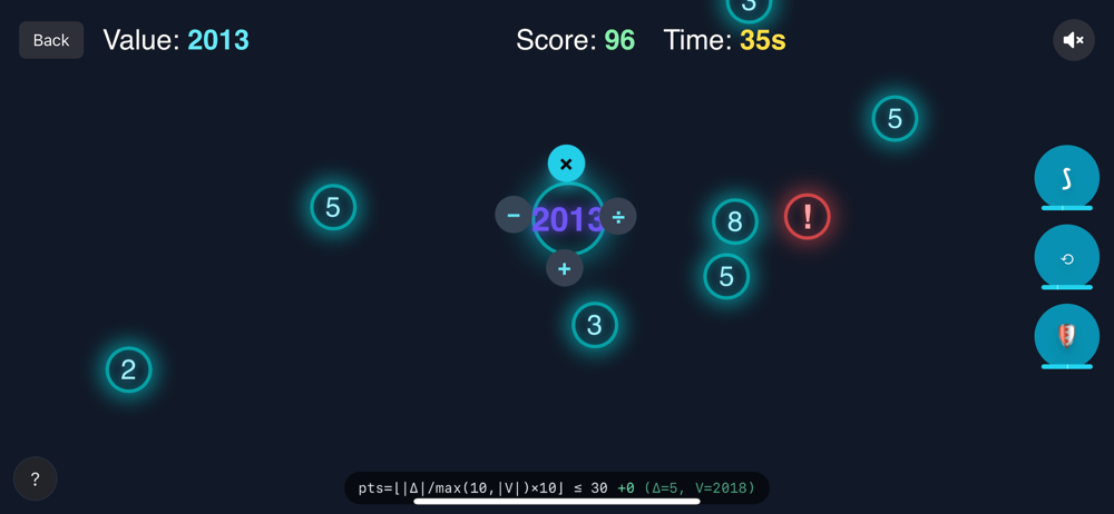 Welcome to Math Arena: Operation Battle, a fast-paced math combat game where quick thinking meets tactical precision. Your objective is simple yet challenging: in Campaign mode, reach the Target number before you run out of hearts, while in Endless mode you must survive and score as high as possible by lasting longer and calculating smarter. Controls are intuitive and action-packed: single tap or click cycles your operator (+, -, x, /), double tap or double click dashes you toward the cursor or tap with brief invulnerability, and abilities are triggered via buttons on the right . During gameplay, collecting blue orbs applies their numbers using your chosen operator, while dangerous red orbs act as hazards—costing you one heart in Campaign or decreasing your value in Endless. Master your abilities: Shield blocks hits in its arc, Blink phases through obstacles, and Repel pushes nearby orbs away to buy breathing room. Victory in Campaign comes when your value equals the Target, while Game Over strikes if you lose all hearts or your value drops to 0 or below. Endless scoring rewards proportional changes: points are earned as pts = floor(|Delta| / max(10, |V|) * 10), capped at 30, where V is your current value and Delta the change after a hit. Bigger proportional shifts from clever multiplication or division score more, while addition and subtraction help fine-tune when your value is small. Outsmart the numbers, master the battlefield, and prove yourself in the ultimate test of math and reflexes.